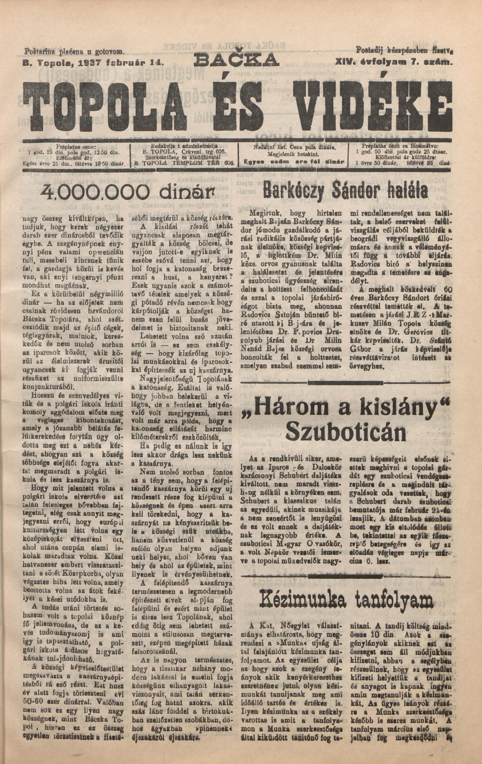 Bačka Topola és Vidéke, 14. évf. 1937. február 14. 7. sz.