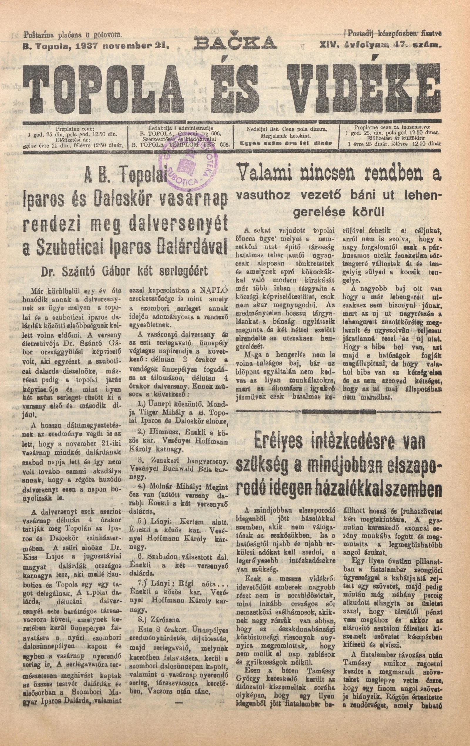 Bačka Topola és Vidéke, 14. évf. 1937. november 21. 47. sz.