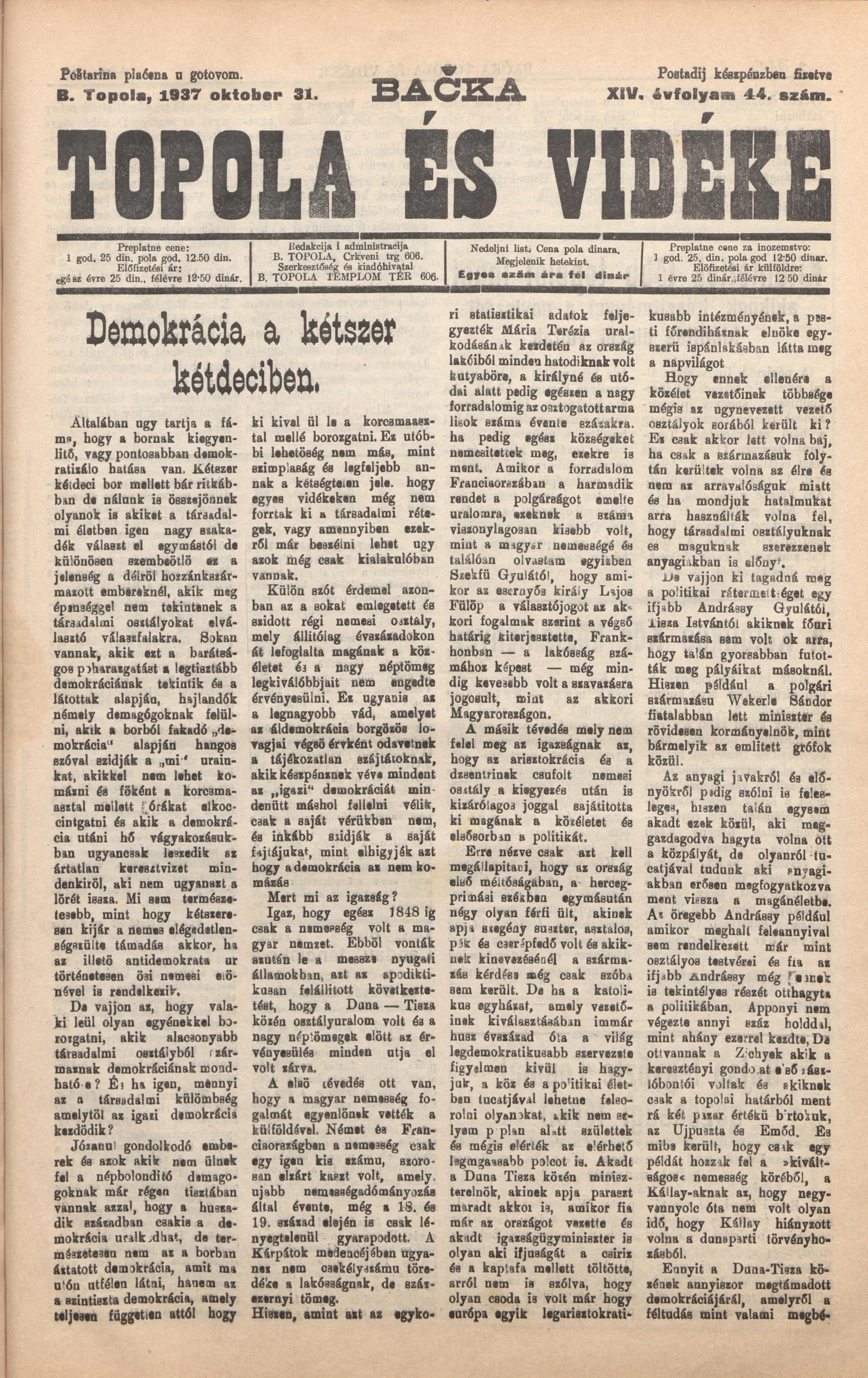 Bačka Topola és Vidéke, 14. évf. 1937. október 31. 44. sz.