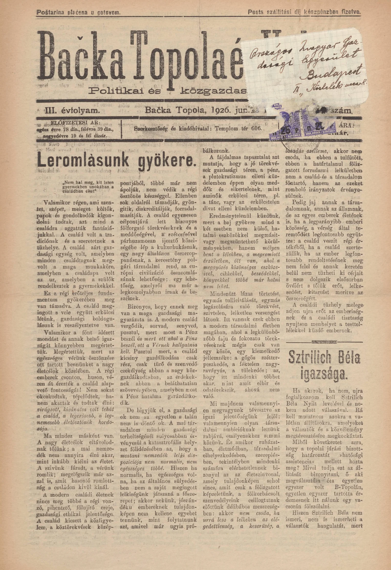 Bačka Topola és Vidéke, 3. évf. 1926. június 13. 24. sz.