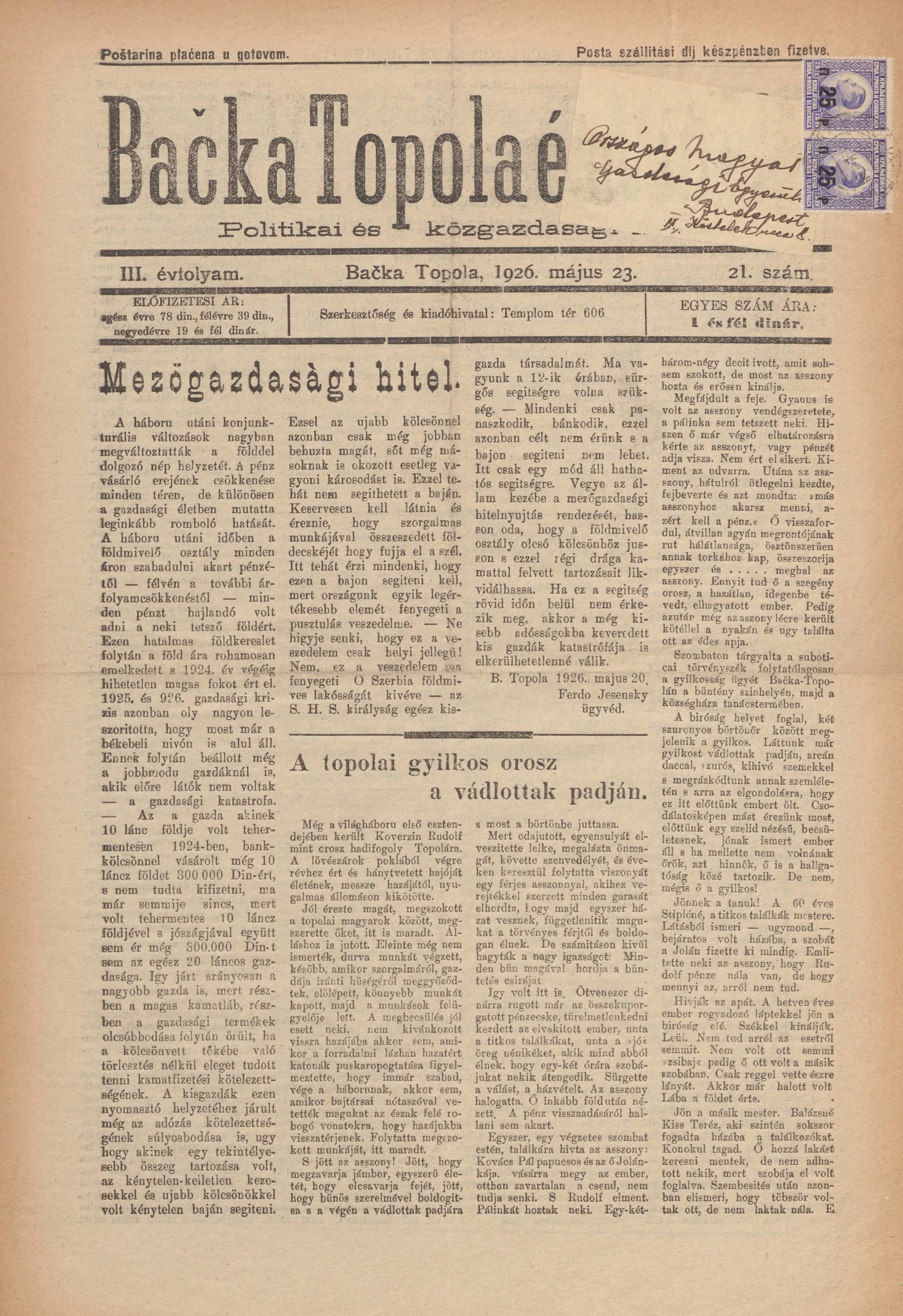 Bačka Topola és Vidéke, 3. évf. 1926. május 23. 21. sz.