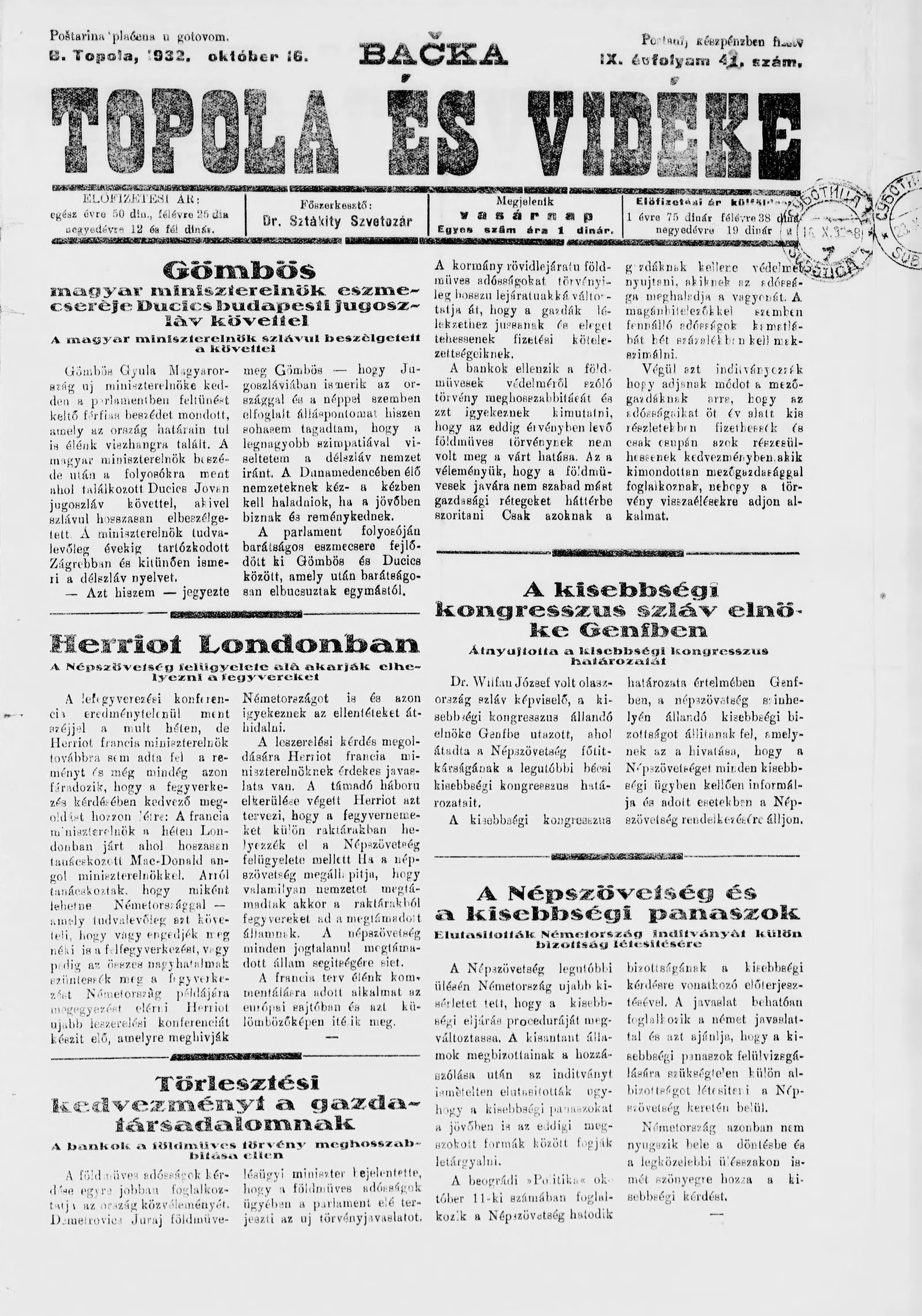 Bačka Topola és Vidéke, 9. évf. 1932. október 16. 42. sz.