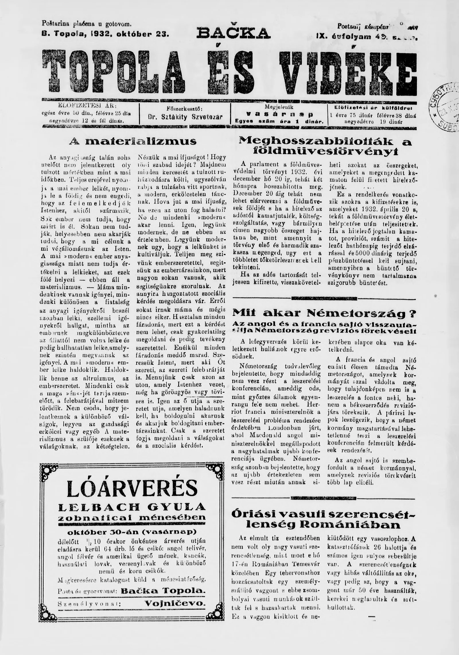 Bačka Topola és Vidéke, 9. évf. 1932. október 23. 43. sz.