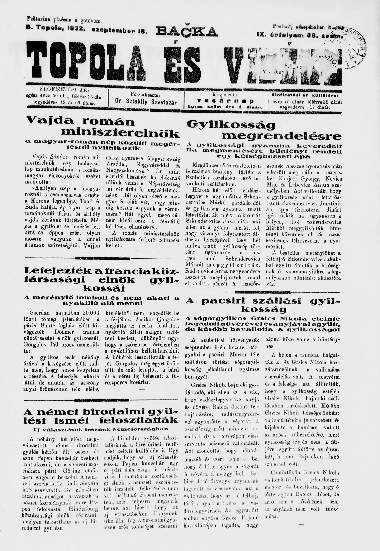 Bačka Topola és Vidéke, 9. évf. 1932. szeptember 18. 38. sz.