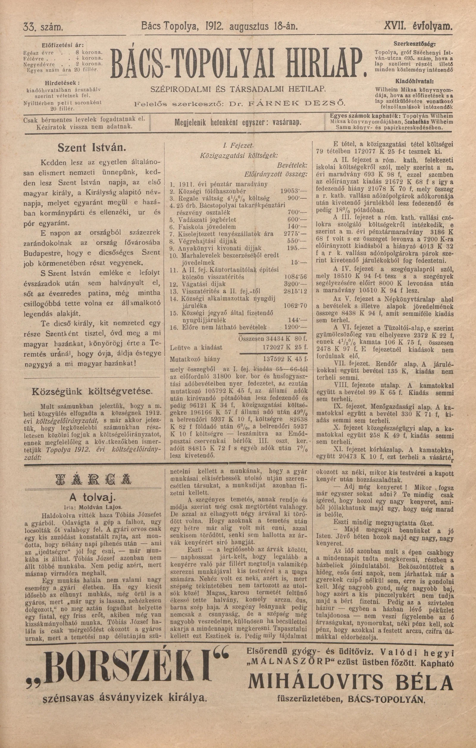 Bács-Topolyai Hirlap, 17. évf. 1912. augusztus 18. 33. sz.