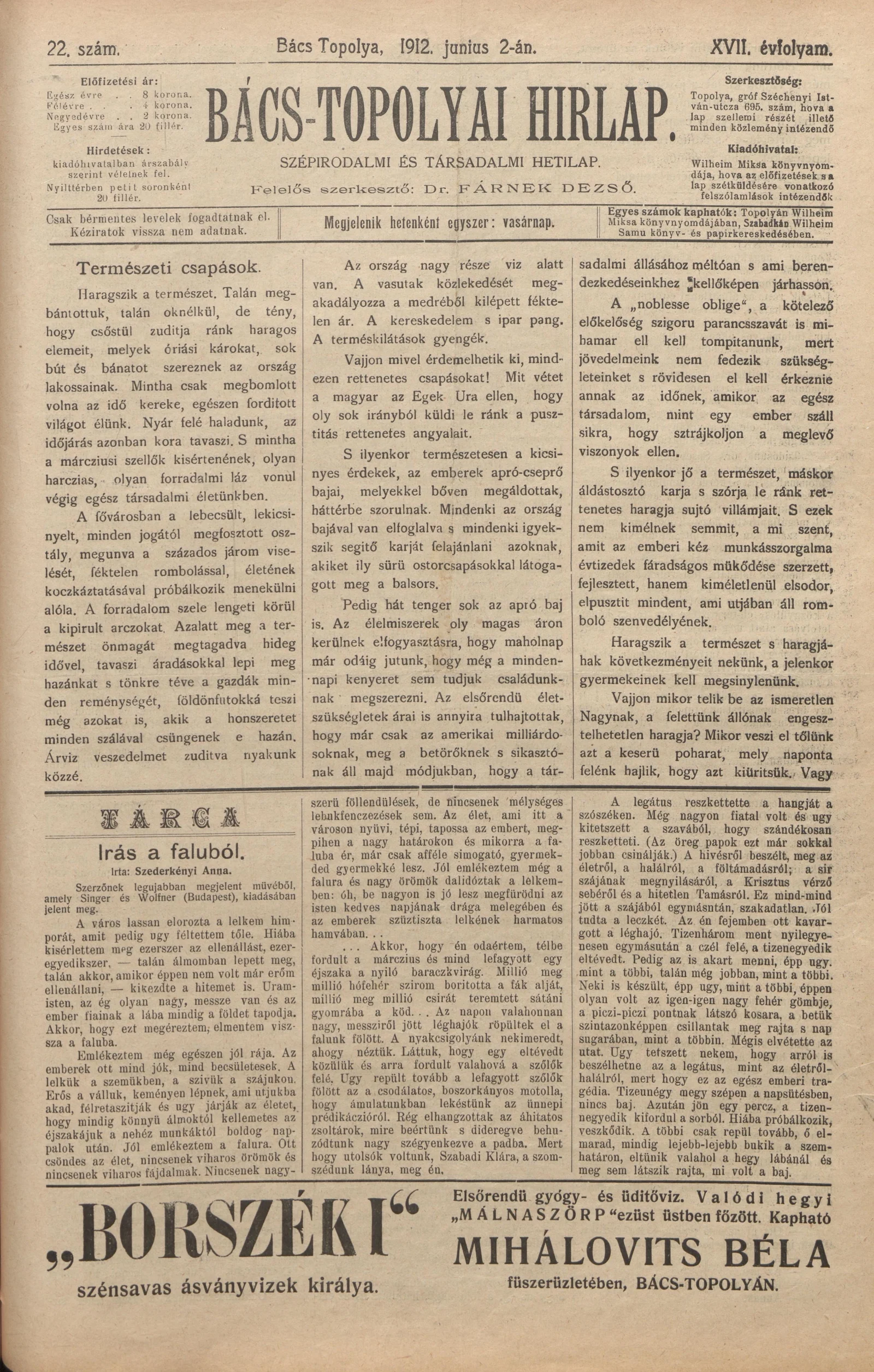 Bács-Topolyai Hirlap, 17. évf. 1912. június 2. 22. sz.