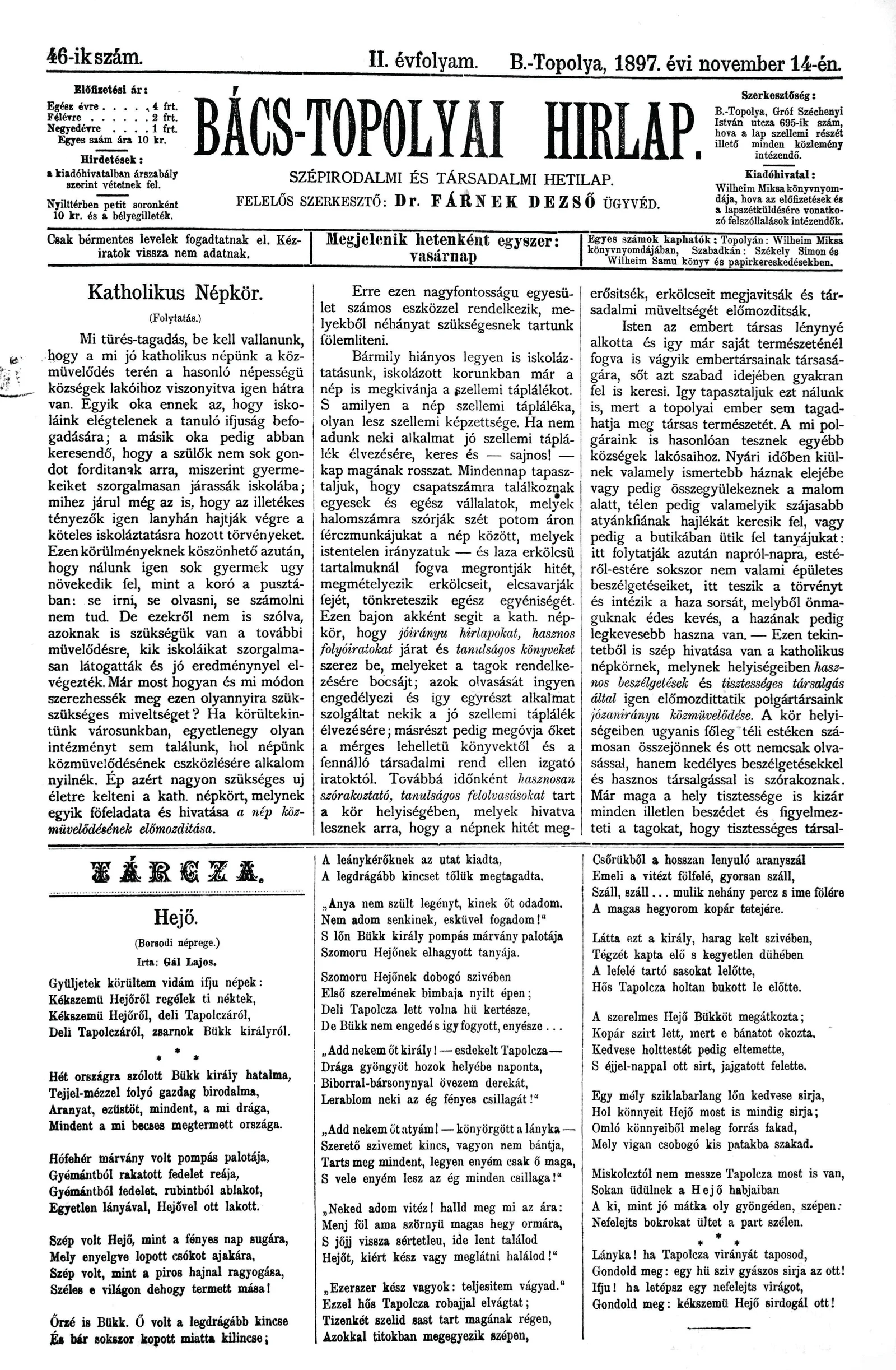 Bács-Topolyai Hirlap, 2. évf. 1897. november 14. 46. sz.
