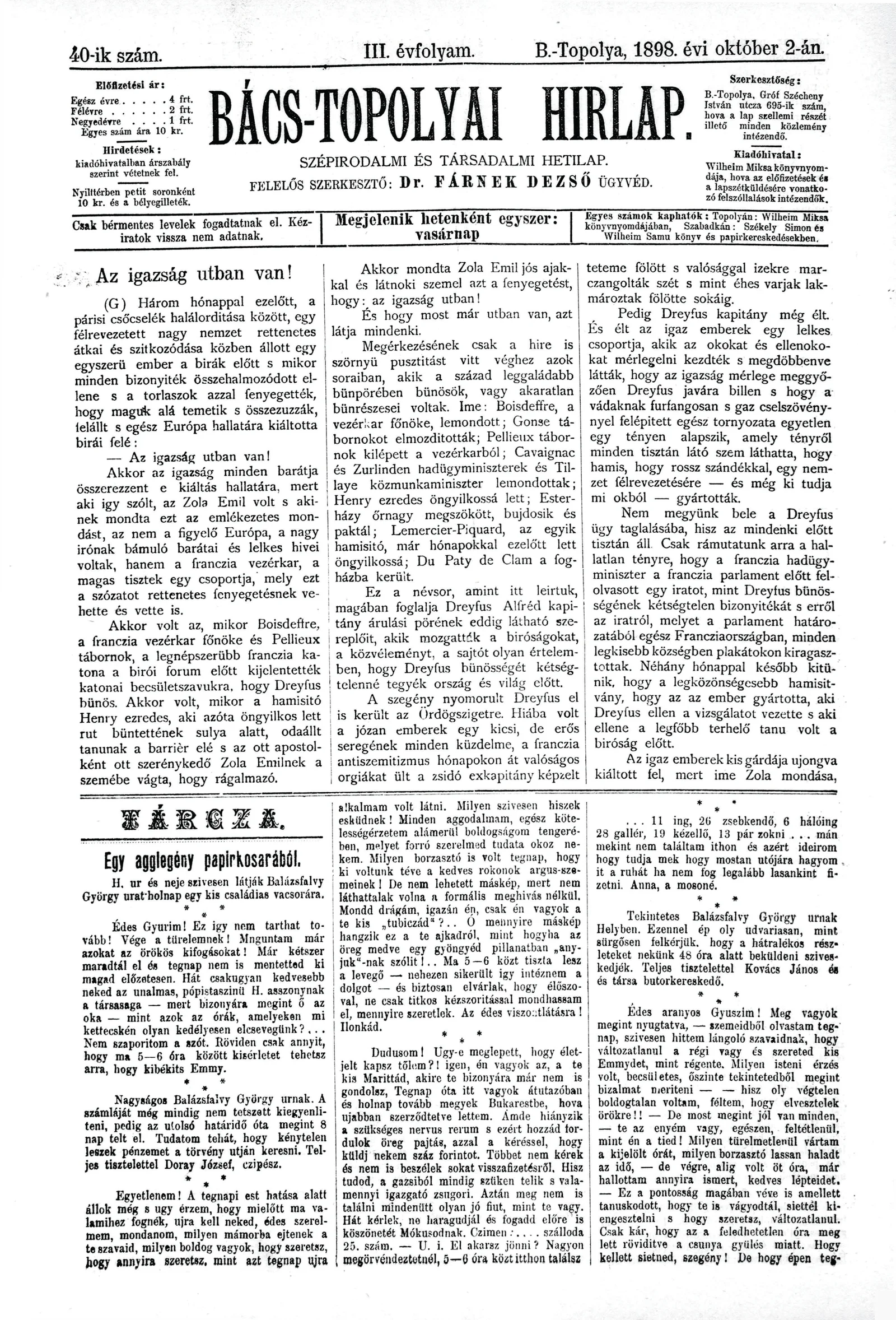 Bács-Topolyai Hirlap, 3. évf. 1898. október 2. 40. sz.