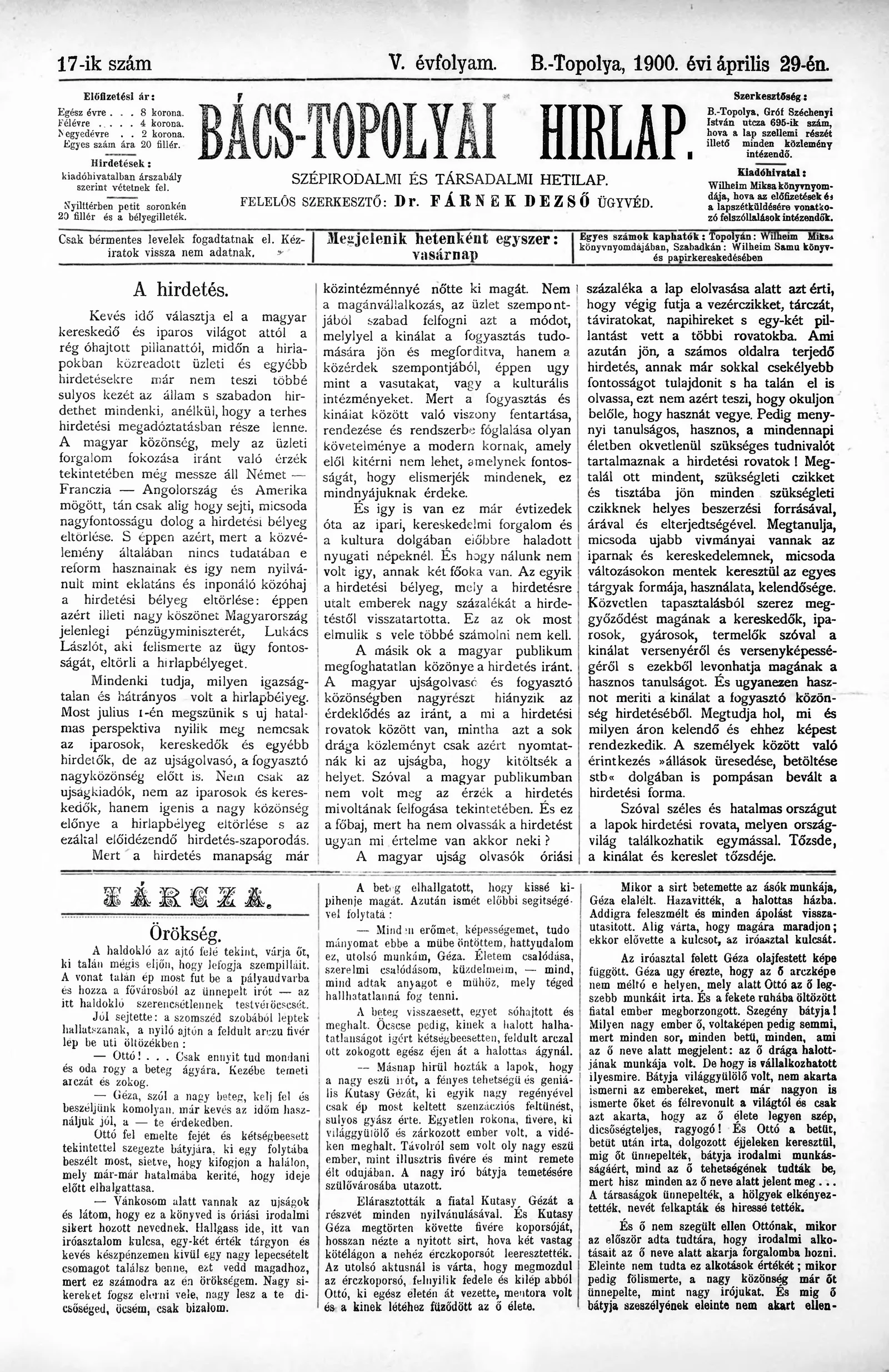 Bács-Topolyai Hirlap, 5. évf. 1900. április 29. 17. sz.
