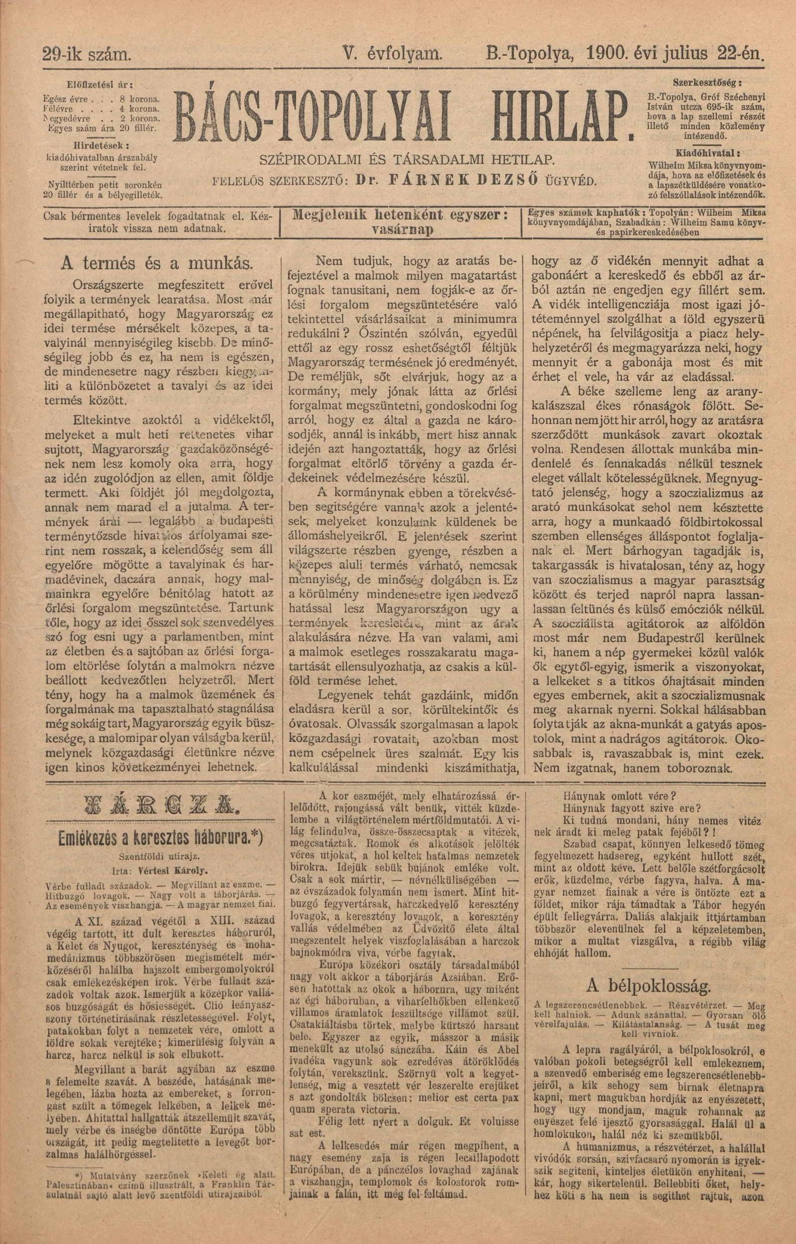Bács-Topolyai Hirlap, 5. évf. 1900. július 22. 29. sz.