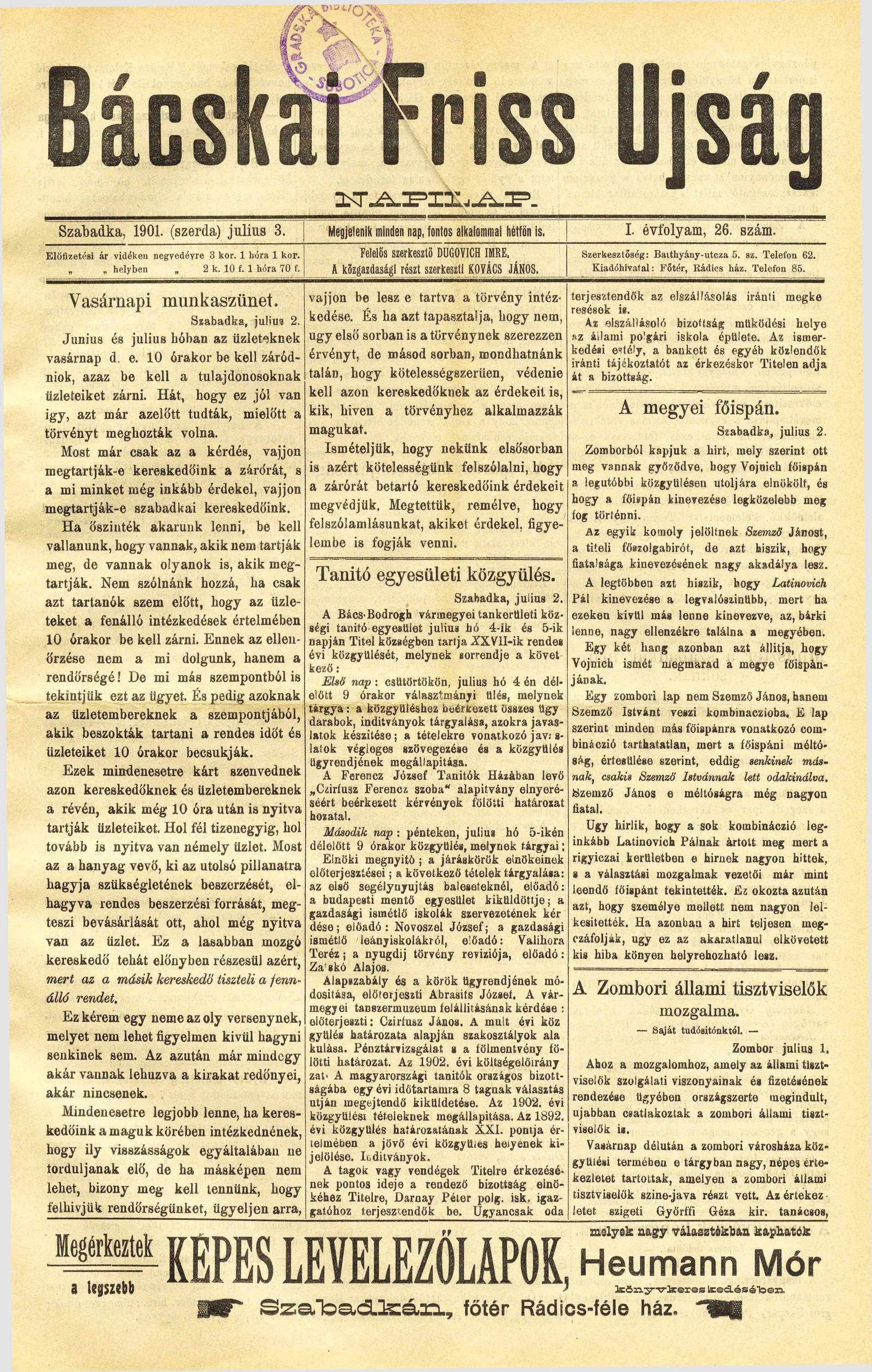 Bácskai Friss Ujság, 1. évf. 1901. július 3. 26. sz.