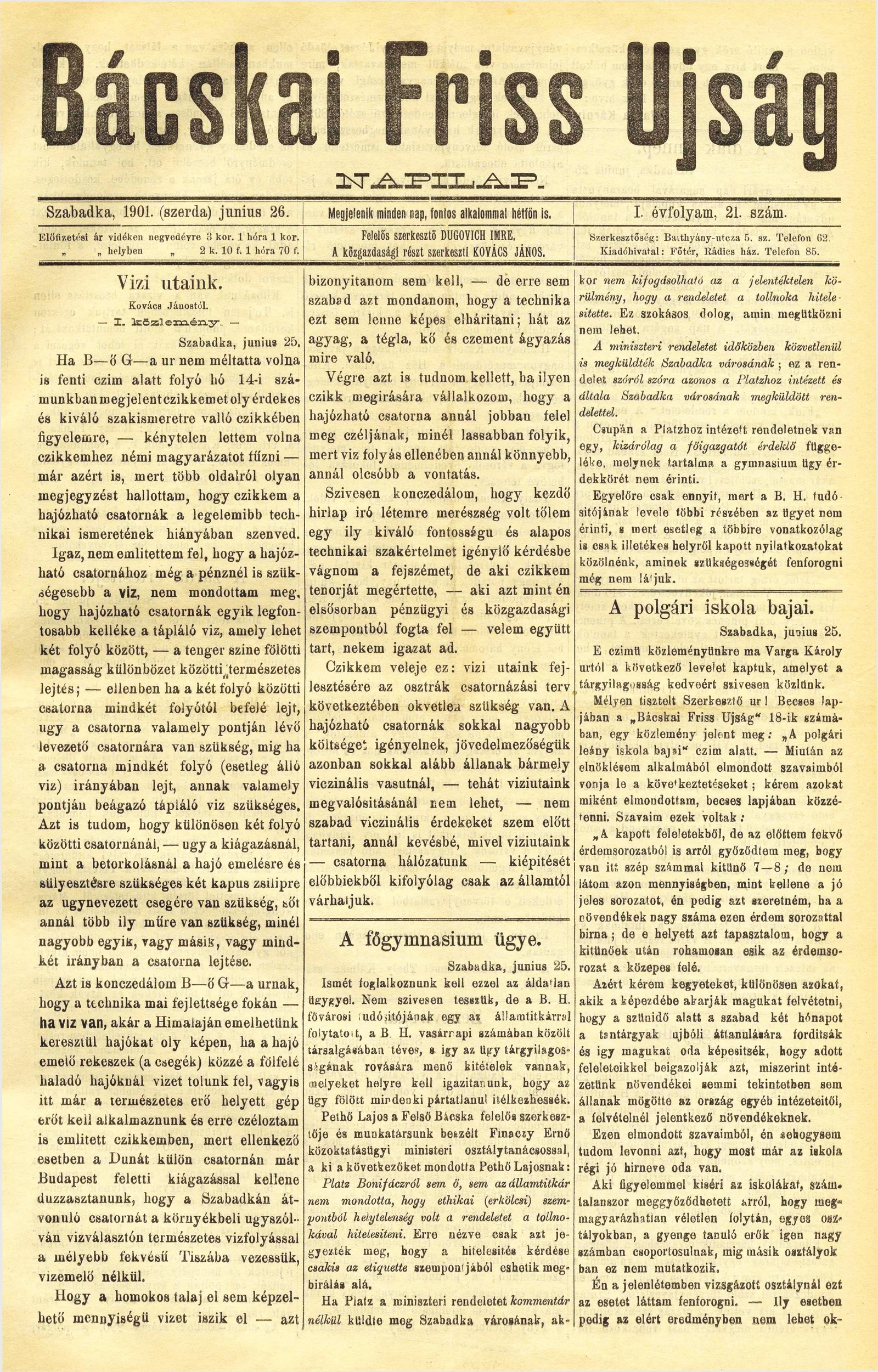 Bácskai Friss Ujság, 1. évf. 1901. június 26. 21. sz.