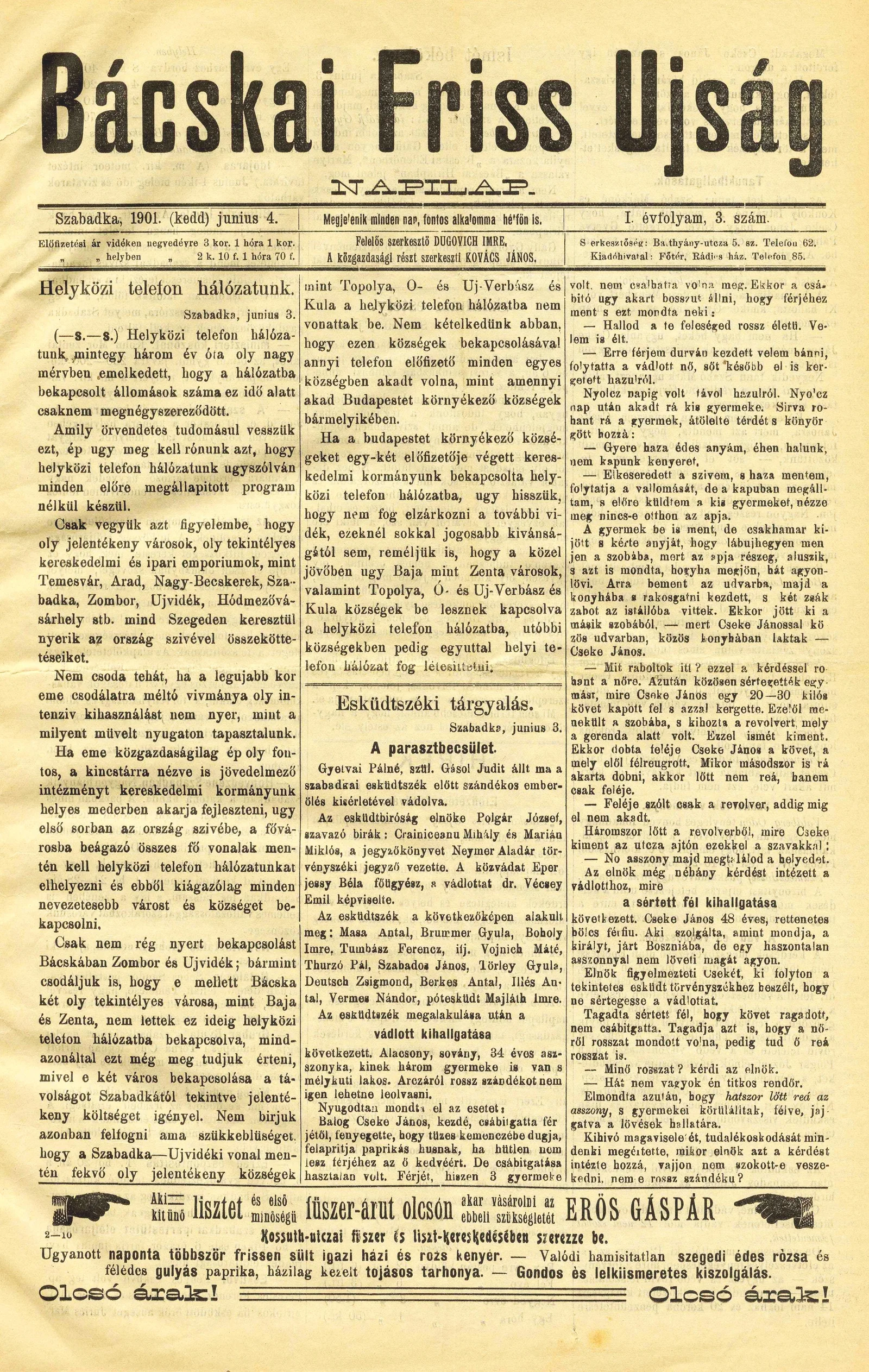 Bácskai Friss Ujság, 1. évf. 1901. június 4. 3. sz.