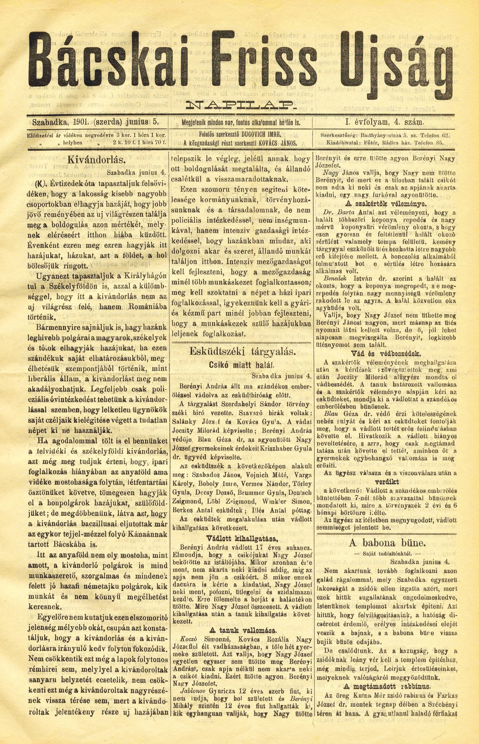 Bácskai Friss Ujság, 1. évf. 1901. június 5. 4. sz.