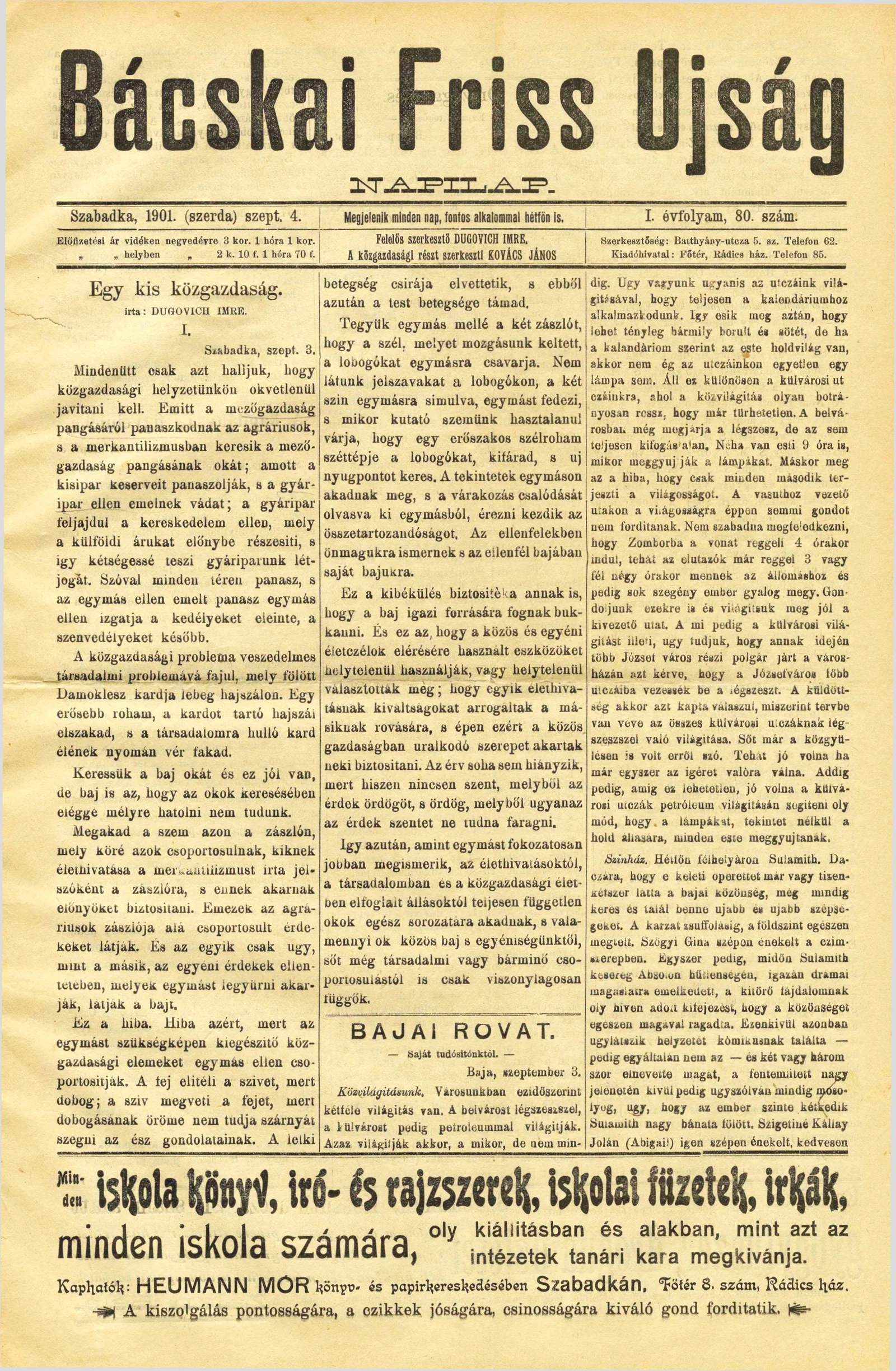 Bácskai Friss Ujság, 1. évf. 1901. szeptember 4. 80. sz.
