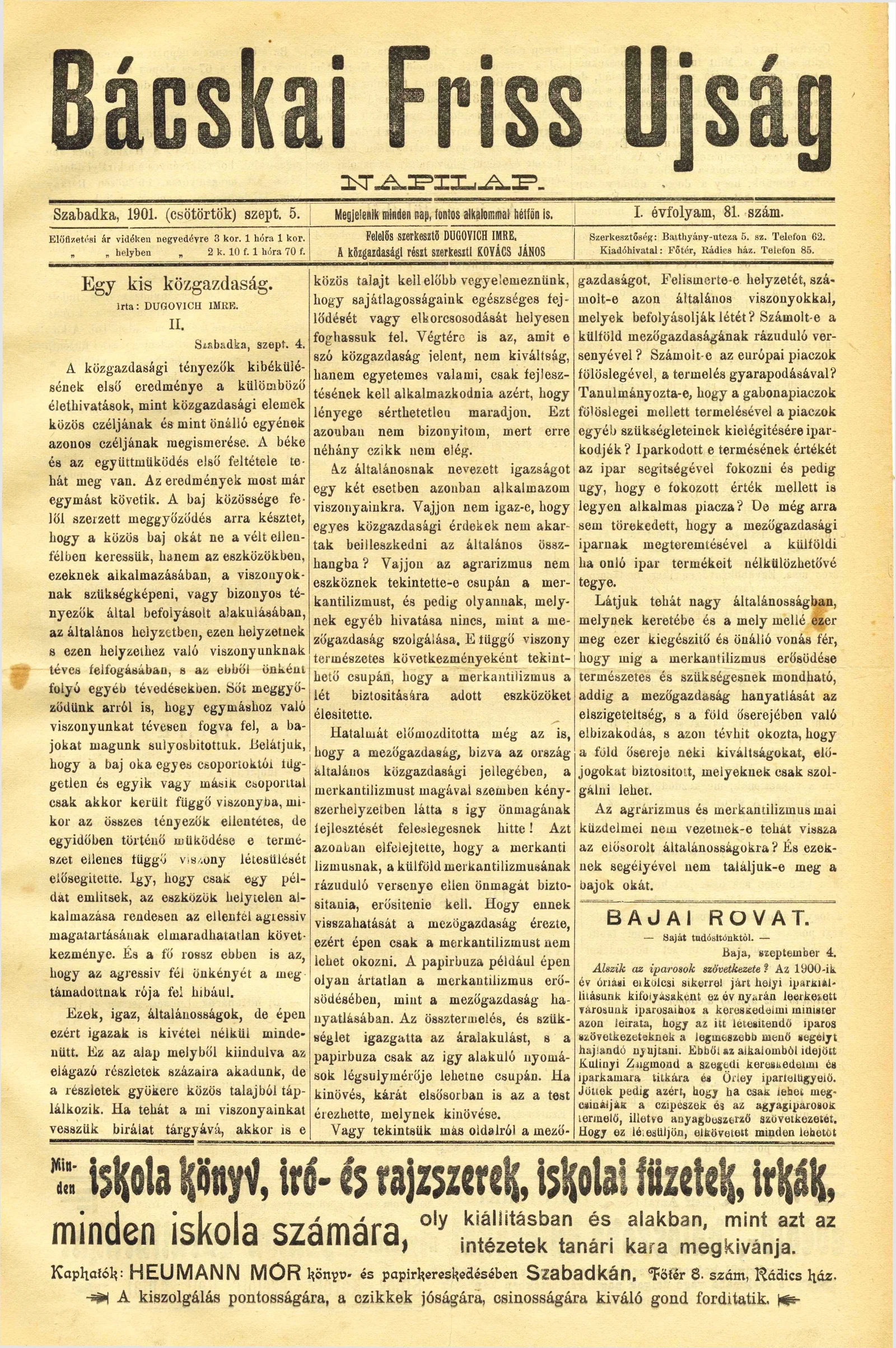 Bácskai Friss Ujság, 1. évf. 1901. szeptember 5. 81. sz.