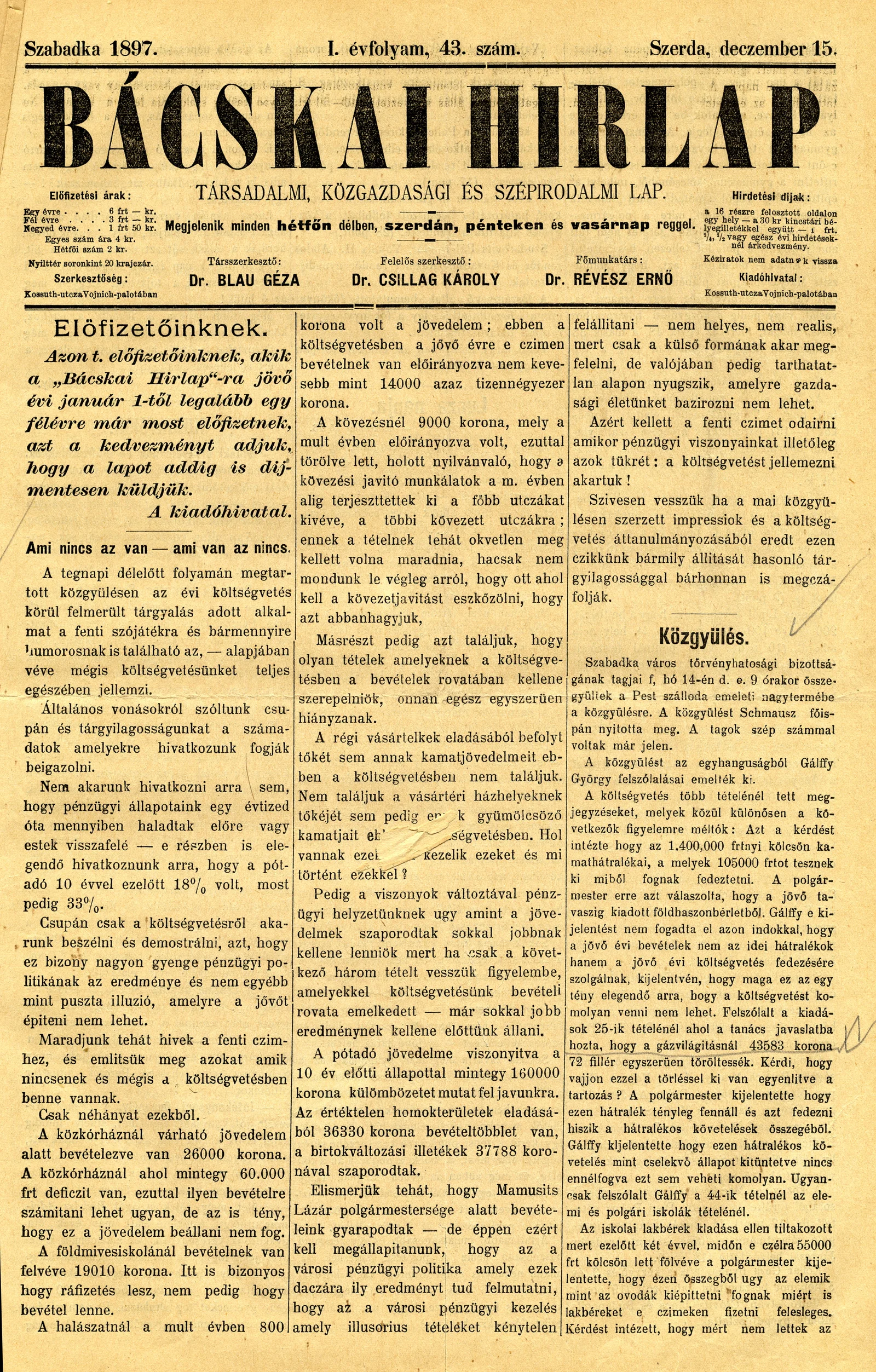 Bácskai Hirlap, 1. évf. 1897. december 15. 43. sz. 1–4. oldal