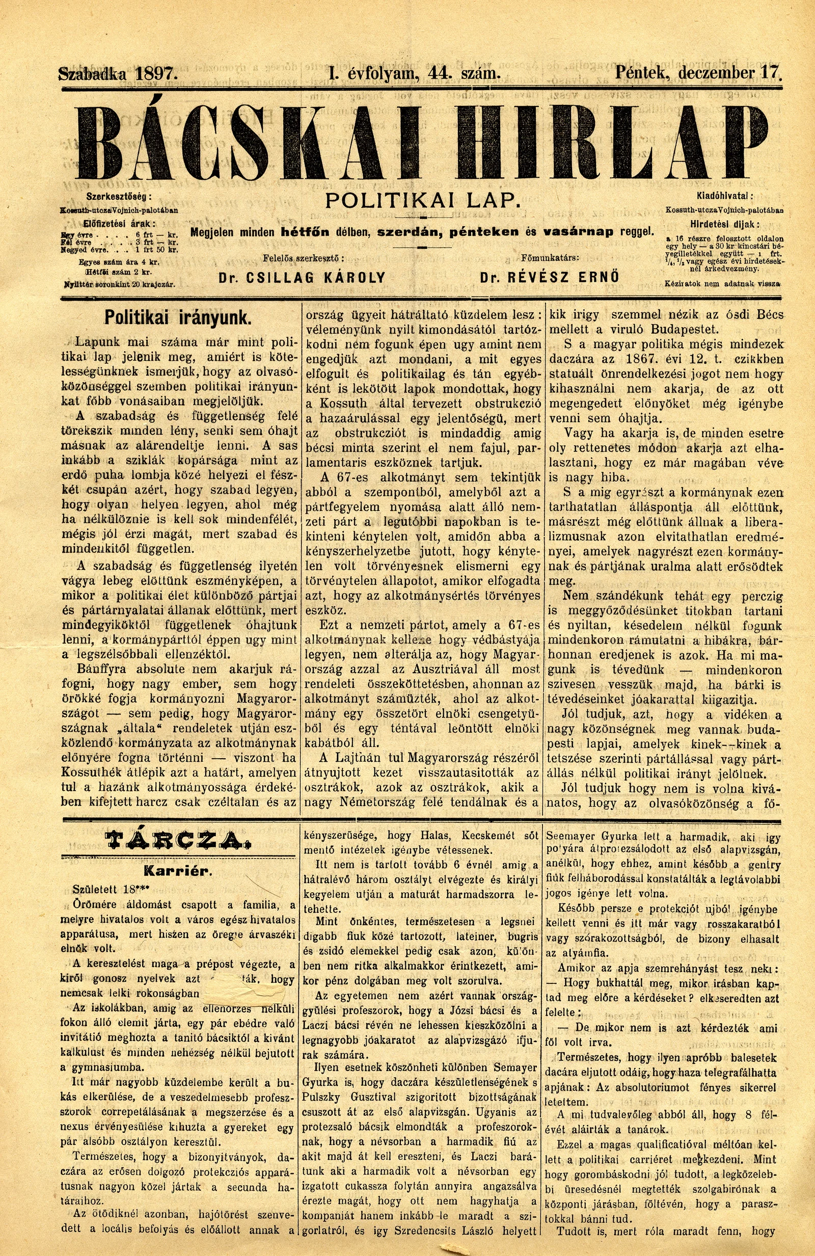 Bácskai Hirlap, 1. évf. 1897. december 17. 44. sz. 1–2. oldal