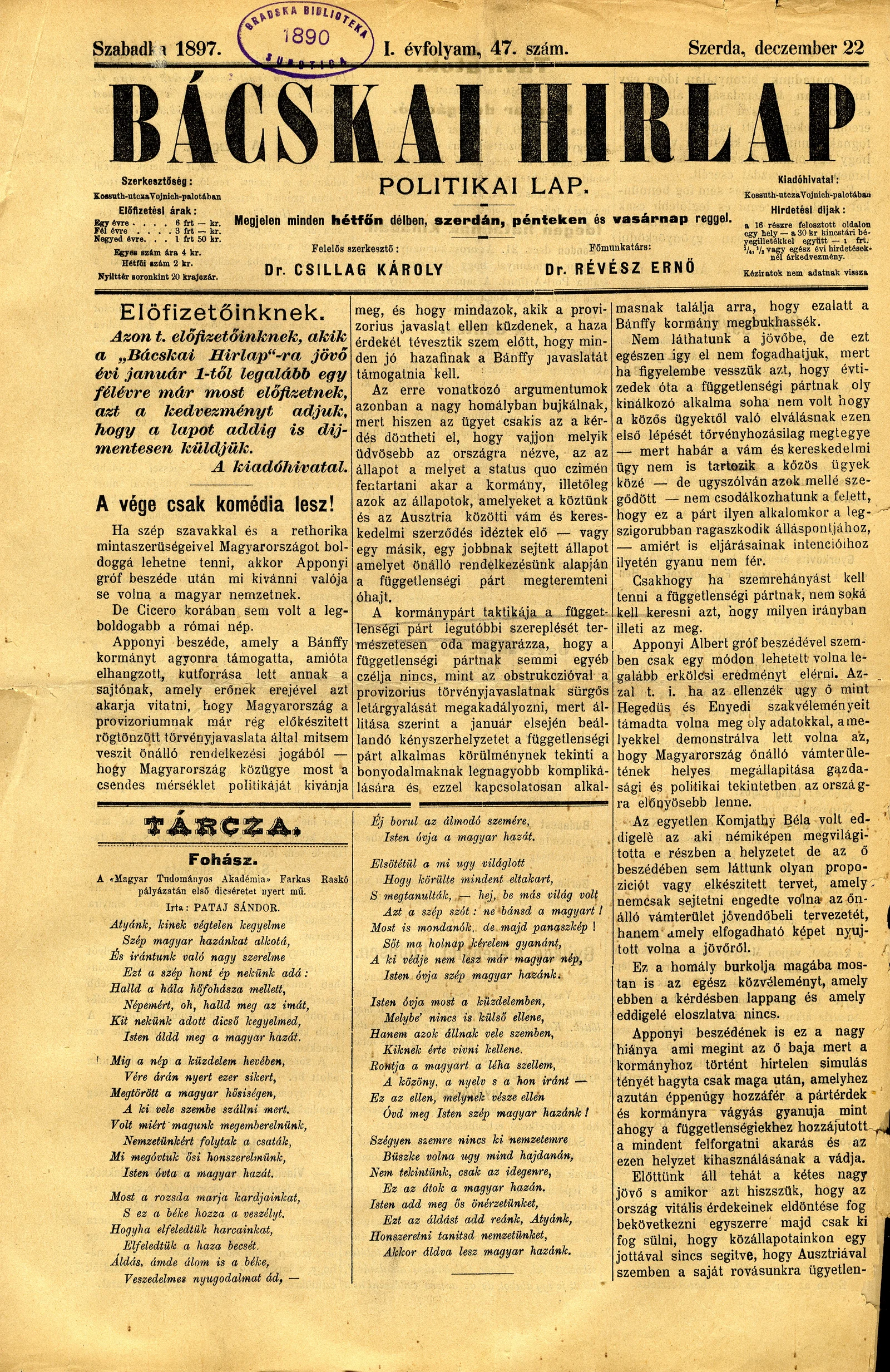 Bácskai Hirlap, 1. évf. 1897. december 22. 47. sz. 1–4. oldal