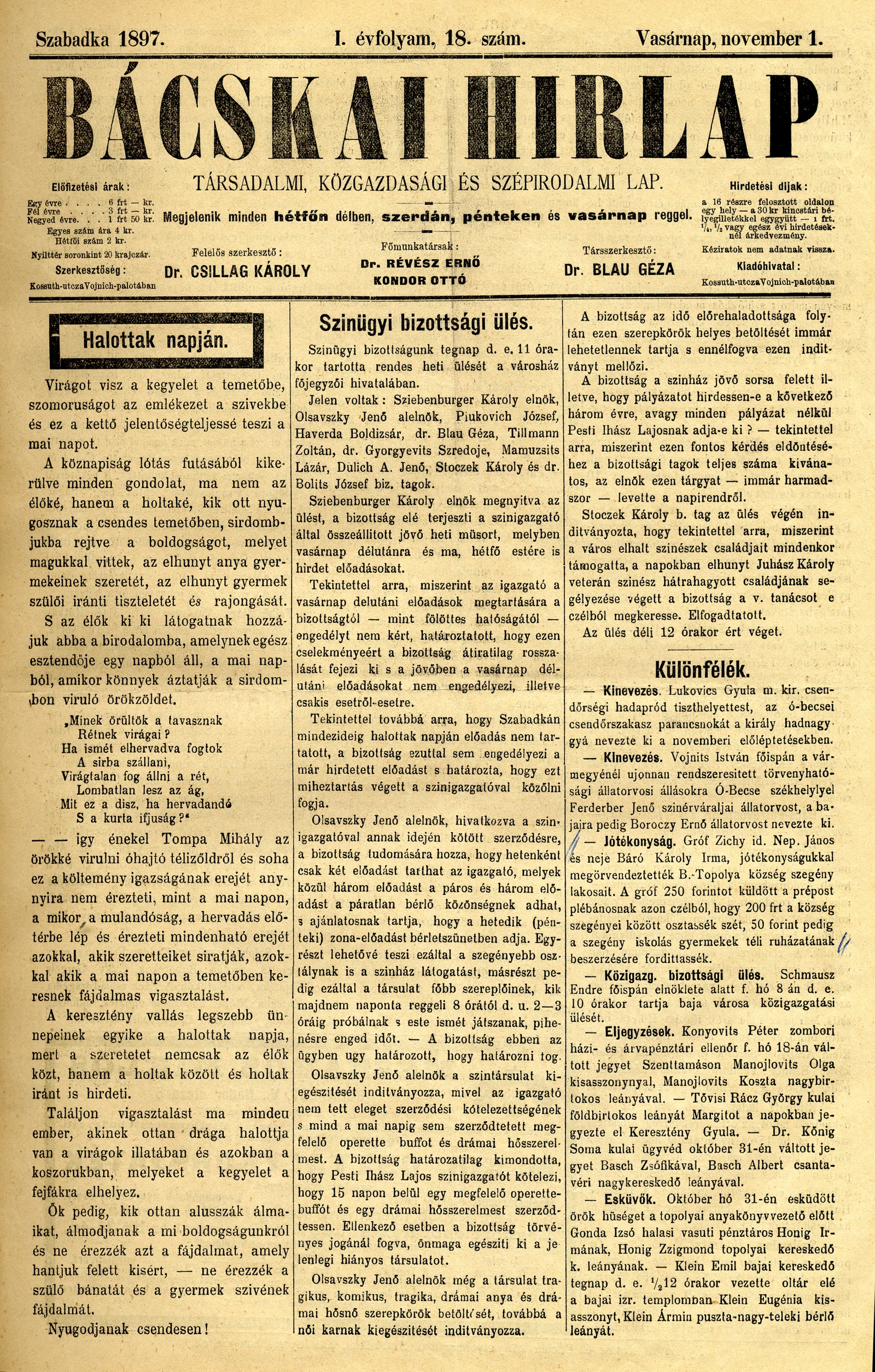 Bácskai Hirlap, 1. évf. 1897. november 1. 18. sz. 1–2. oldal