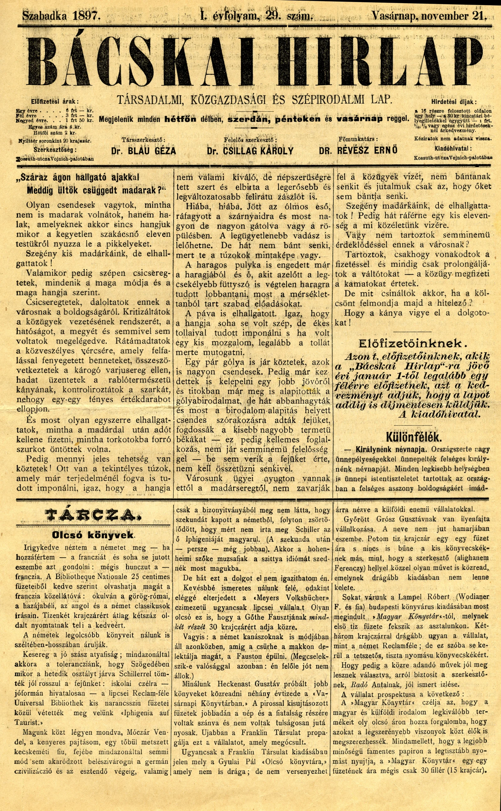 Bácskai Hirlap, 1. évf. 1897. november 21. 29. sz. 1–4. oldal