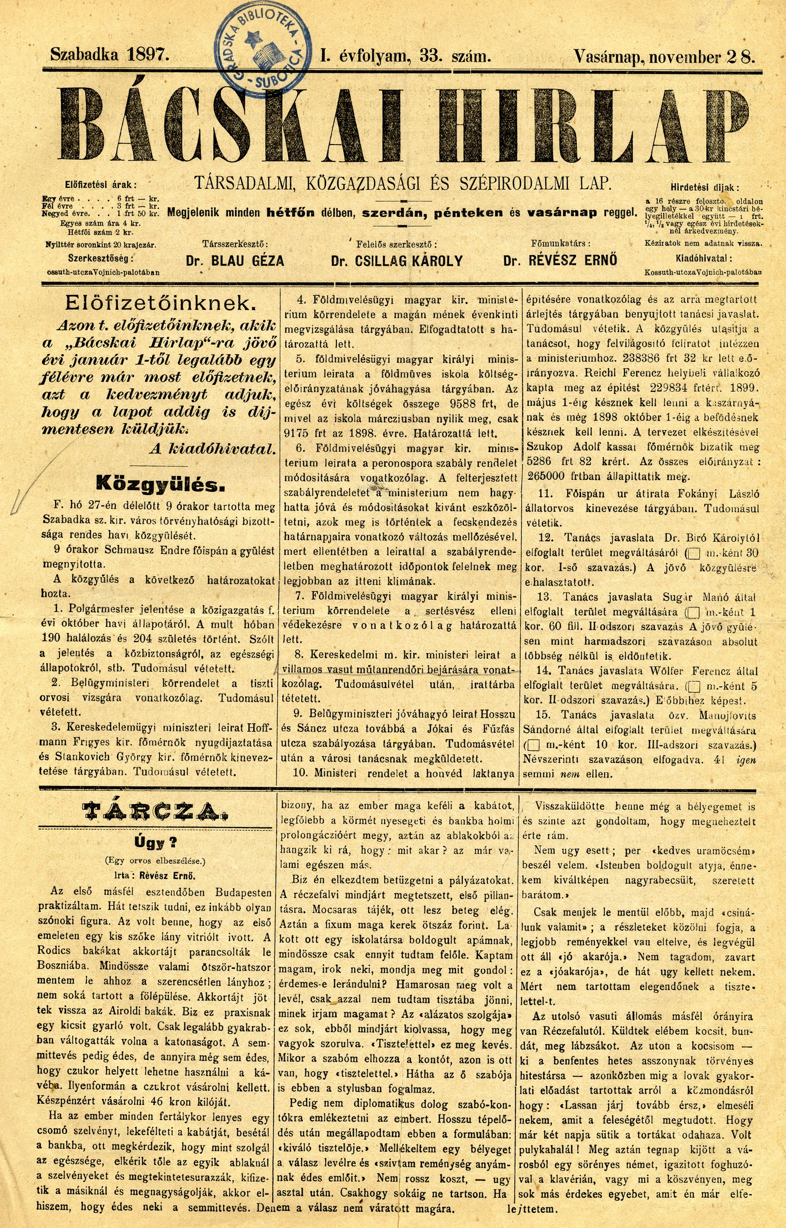 Bácskai Hirlap, 1. évf. 1897. november 28. 33. sz. 1–2. oldal