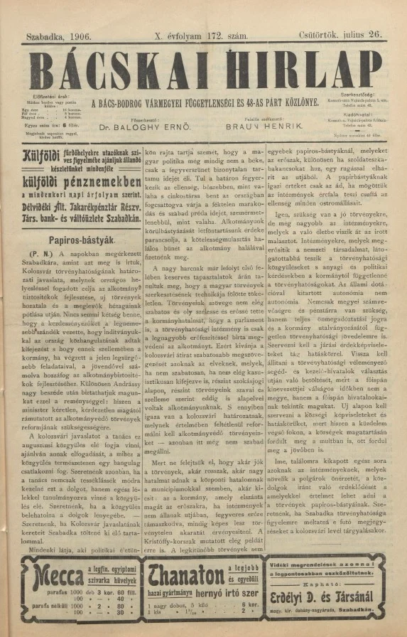 Bácskai Hirlap, 10. évf. 1906. július 26. 172. sz.