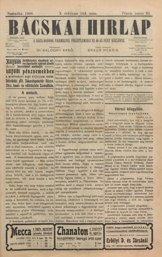 Bácskai Hirlap, 10. évf. 1906. június 22. 144. sz.