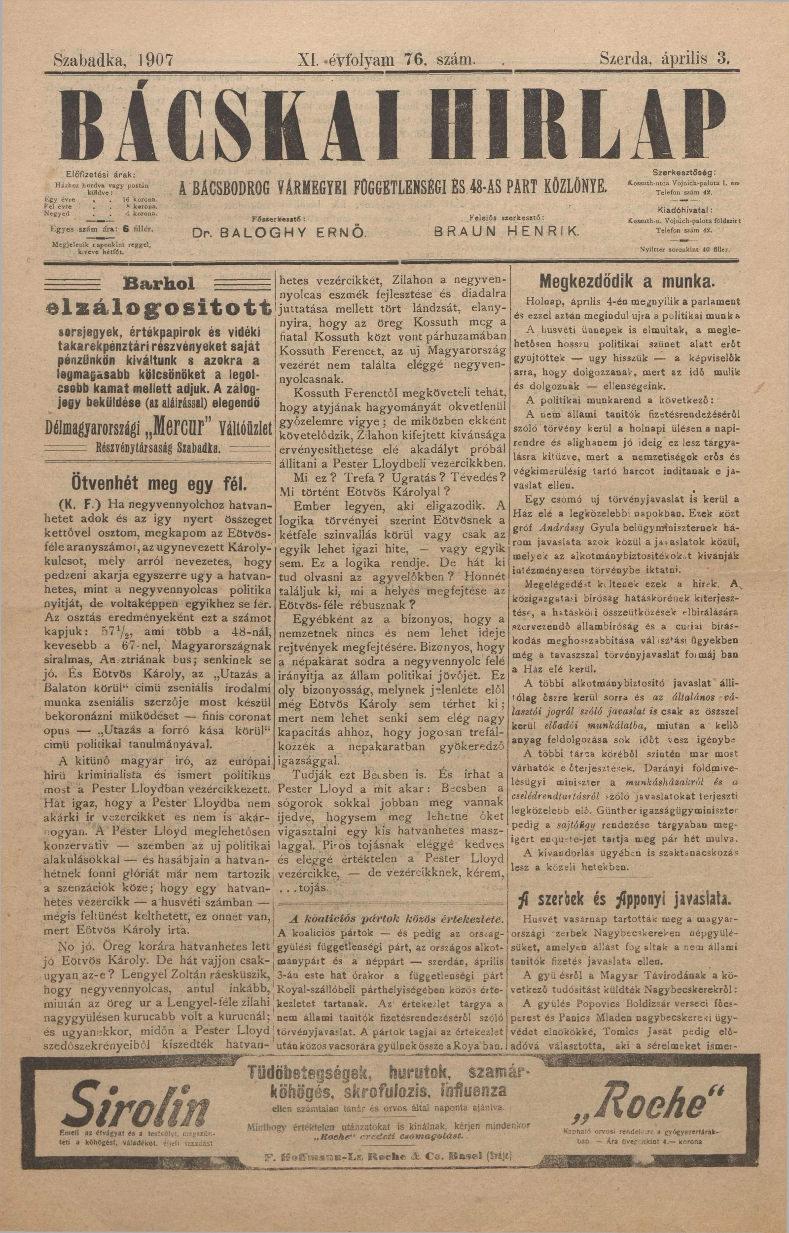 Bácskai Hirlap, 11. évf. 1907. április 3. 76. sz.