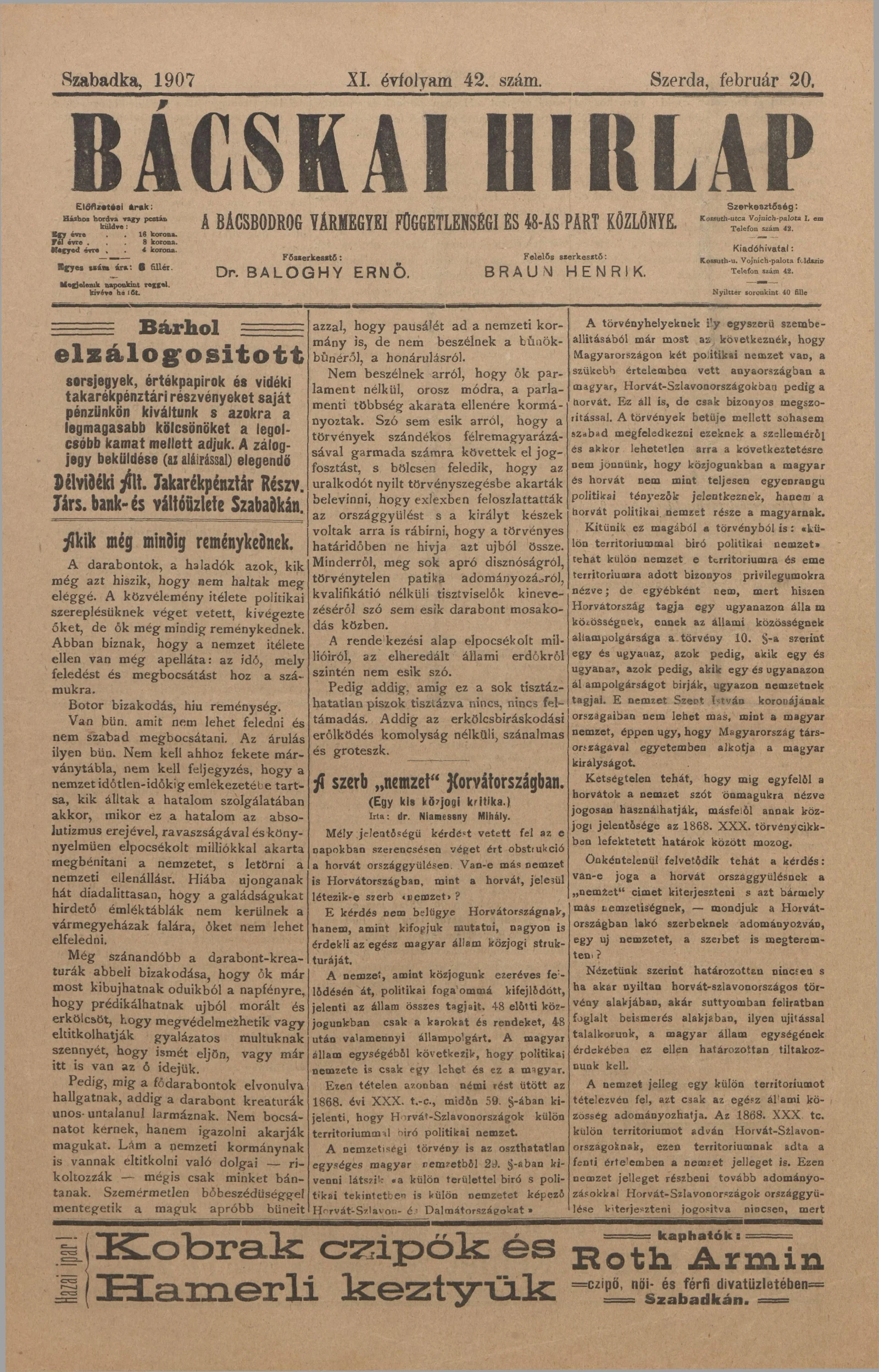 Bácskai Hirlap, 11. évf. 1907. február 20. 42. sz.