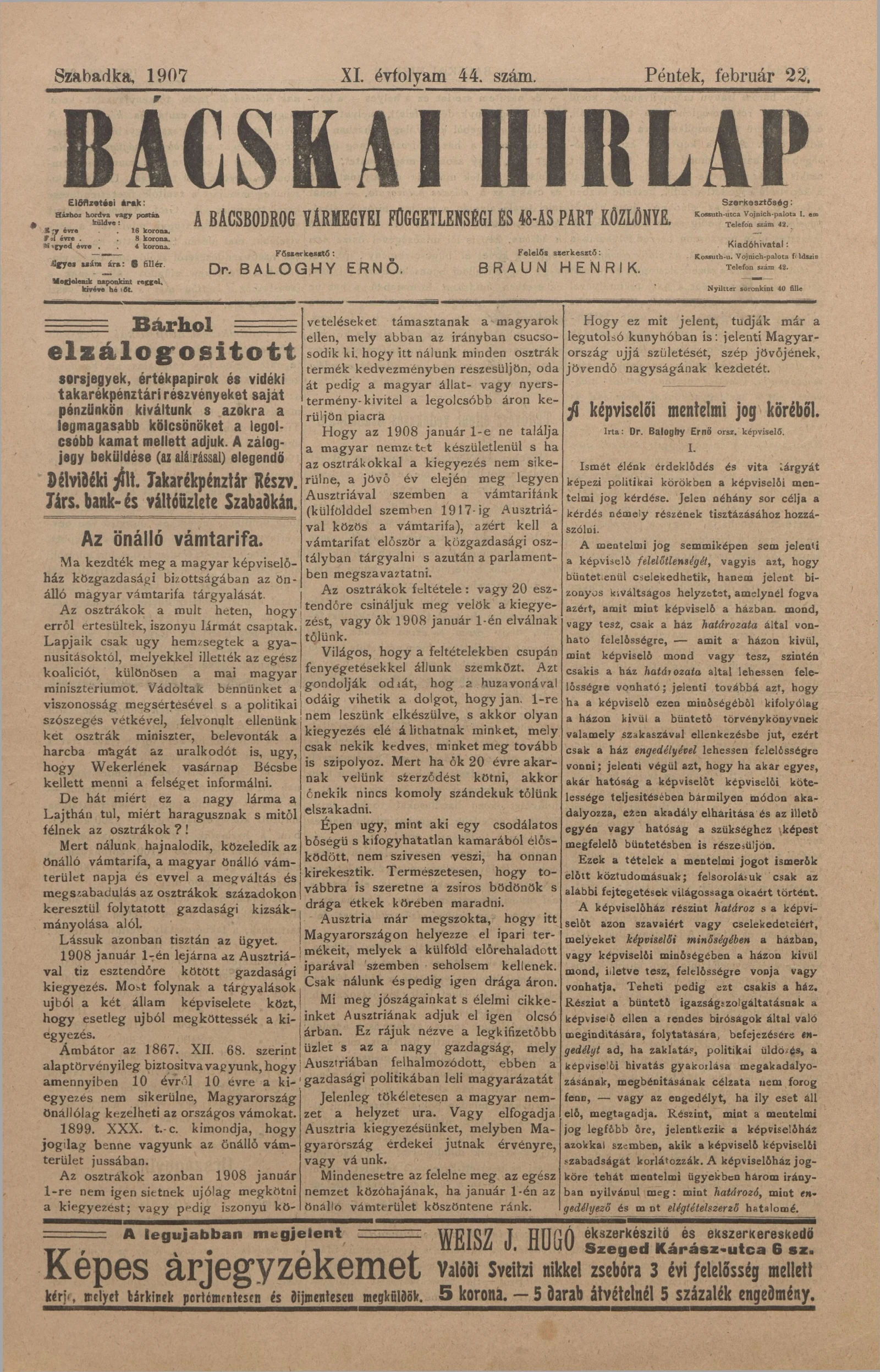 Bácskai Hirlap, 11. évf. 1907. február 22. 44. sz.