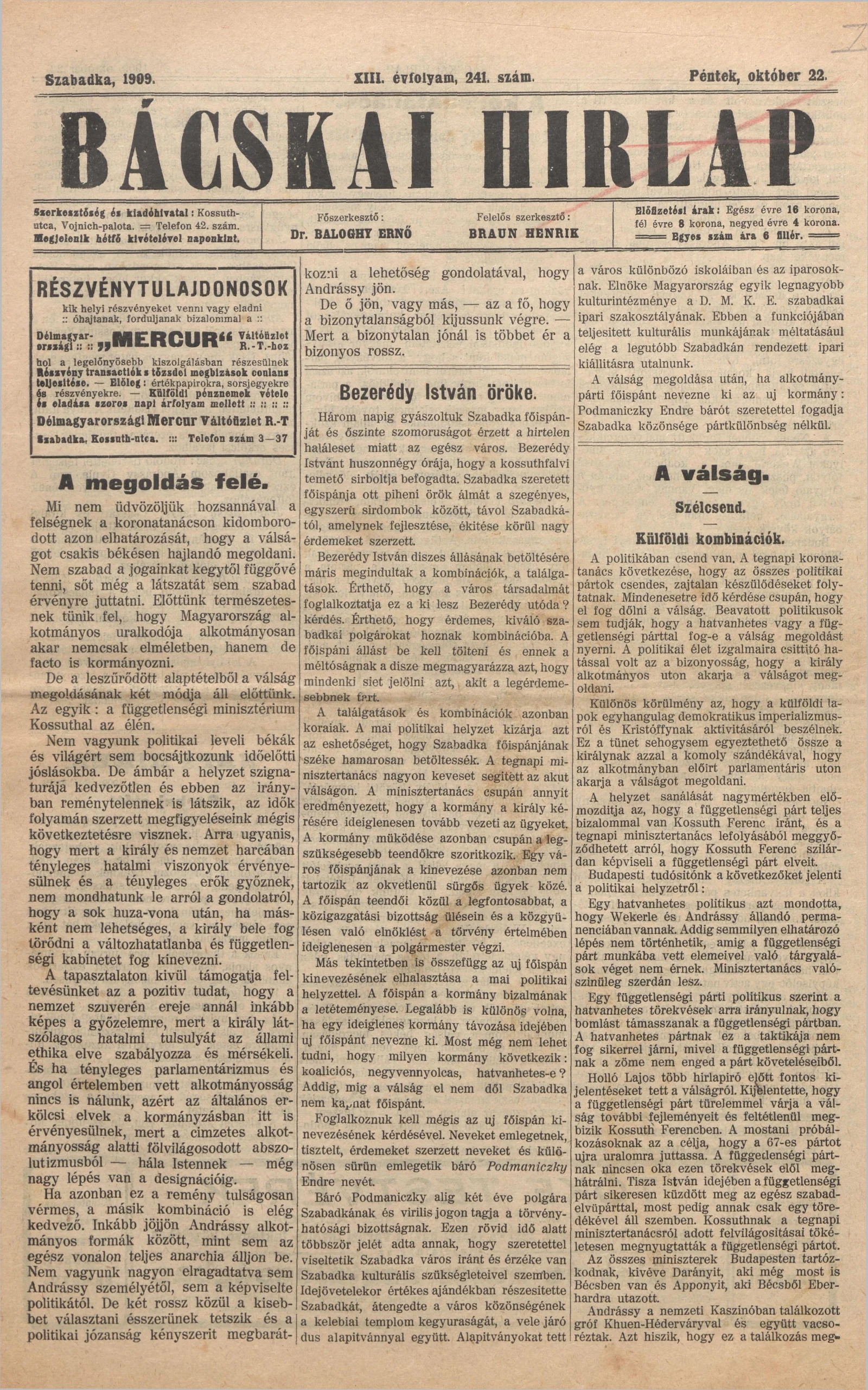 Bácskai Hirlap, 13. évf. 1909. október 22. 241. sz.