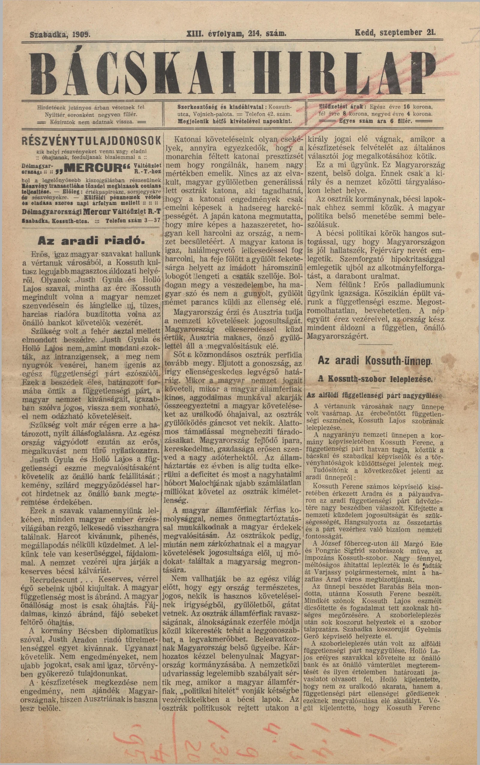 Bácskai Hirlap, 13. évf. 1909. szeptember 21. 214. sz.