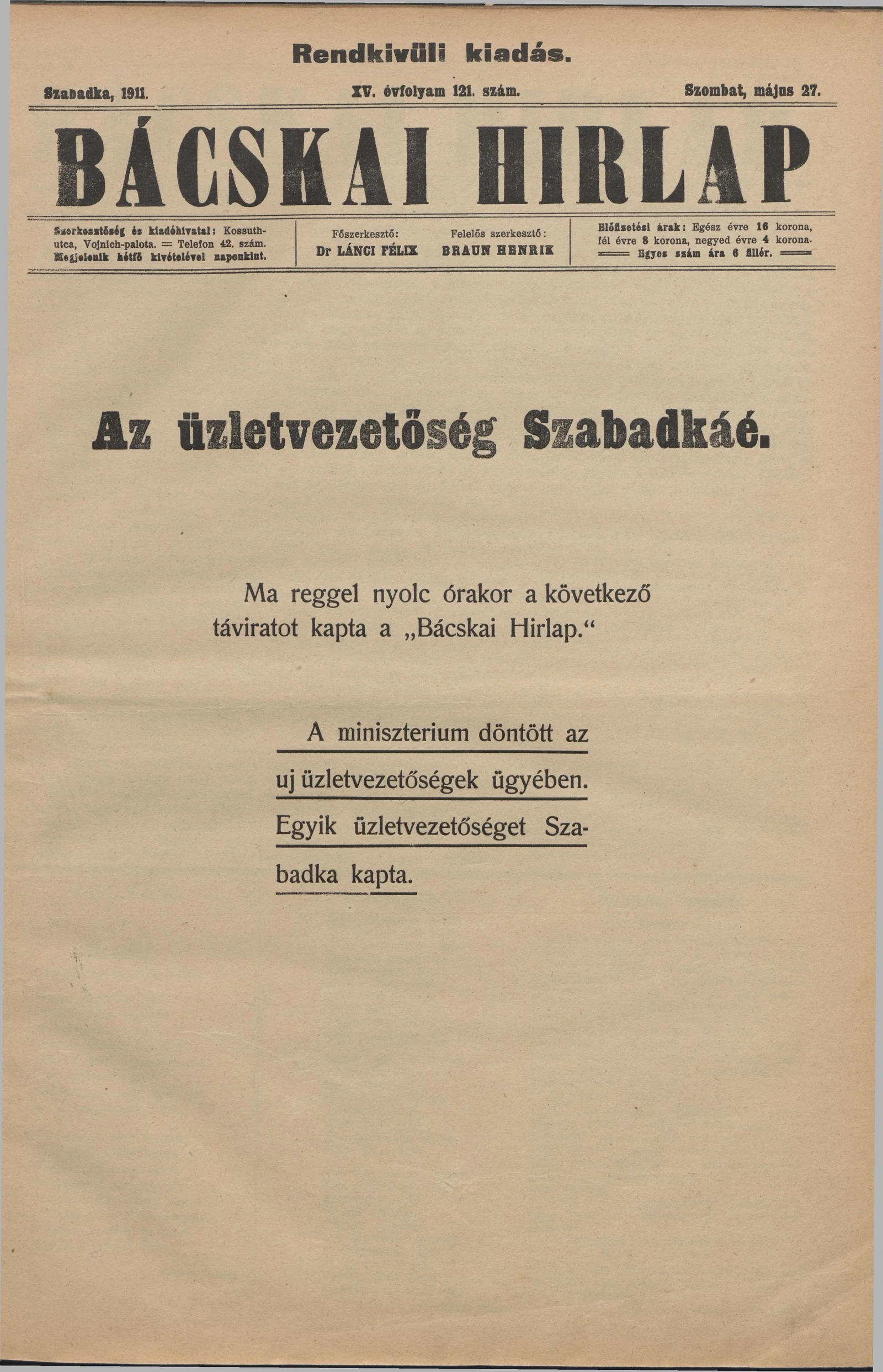 Bácskai Hirlap, 15. évf. 1911. május 27. 121. sz.