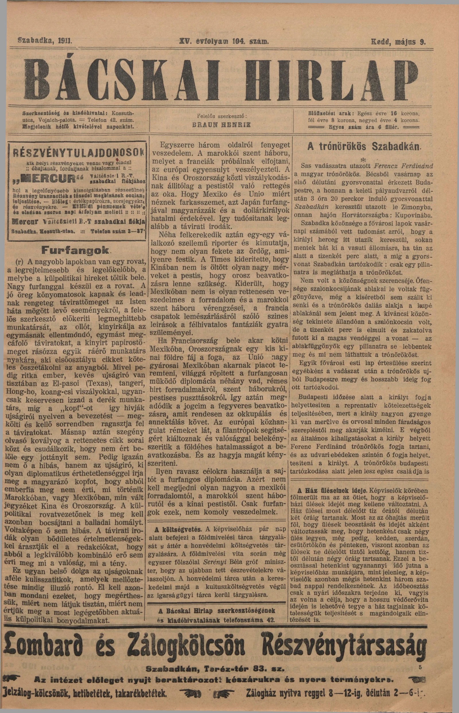 Bácskai Hirlap, 15. évf. 1911. május 9. 104. sz.
