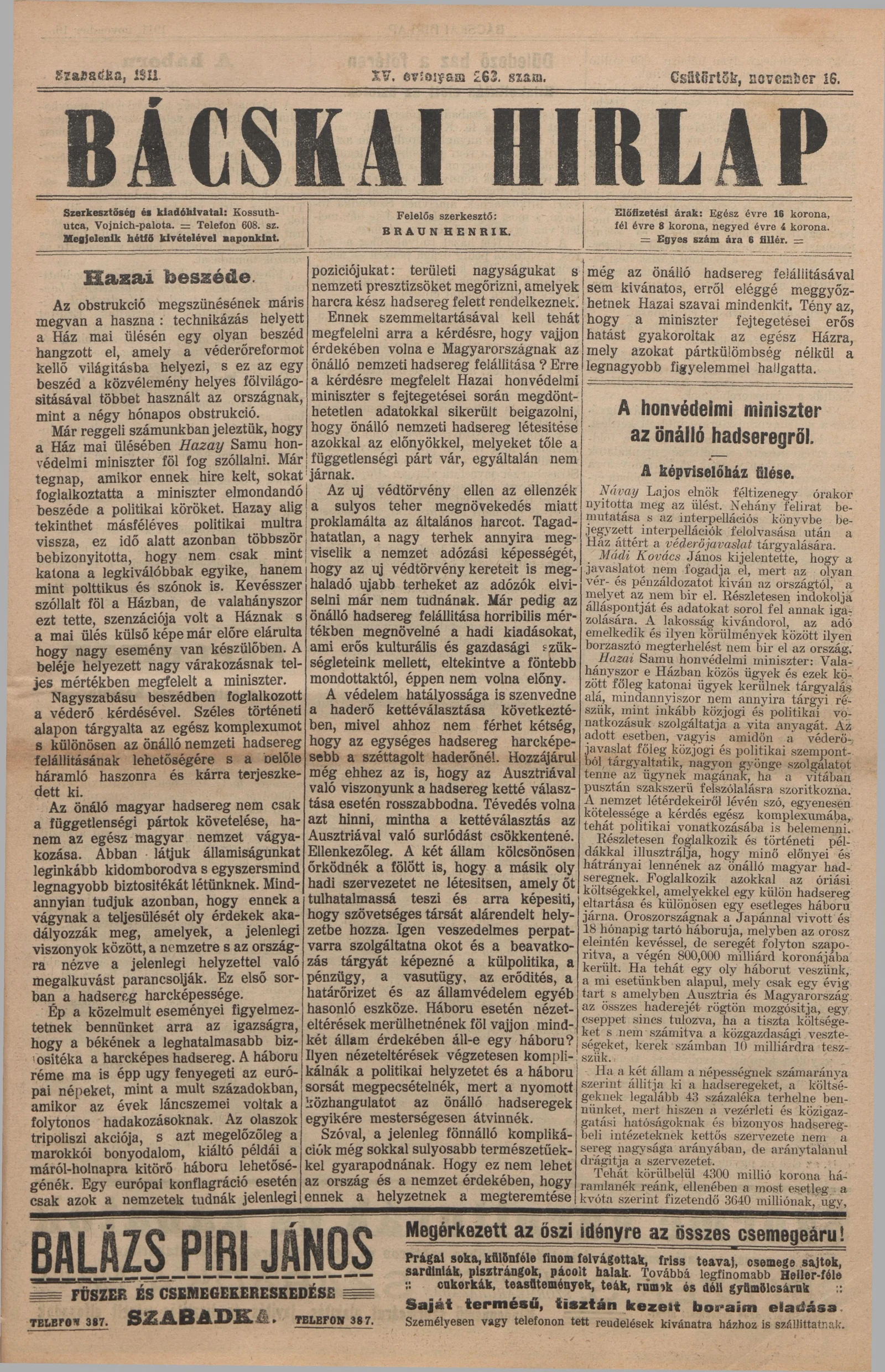 Bácskai Hirlap, 15. évf. 1911. november 16. 263. sz.