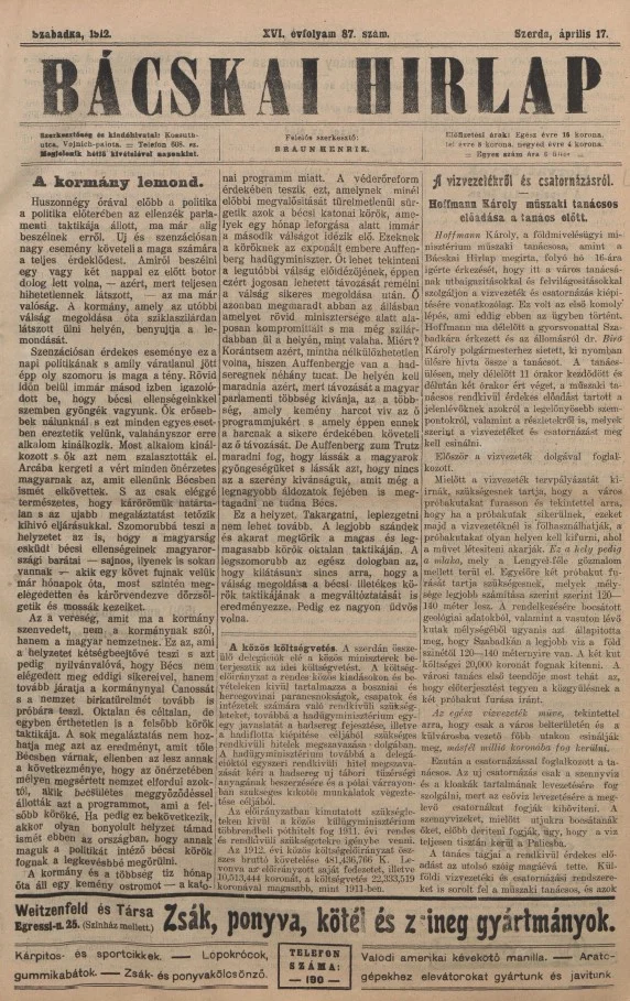 Bácskai Hirlap, 16. évf. 1912. április 17. 87. sz.