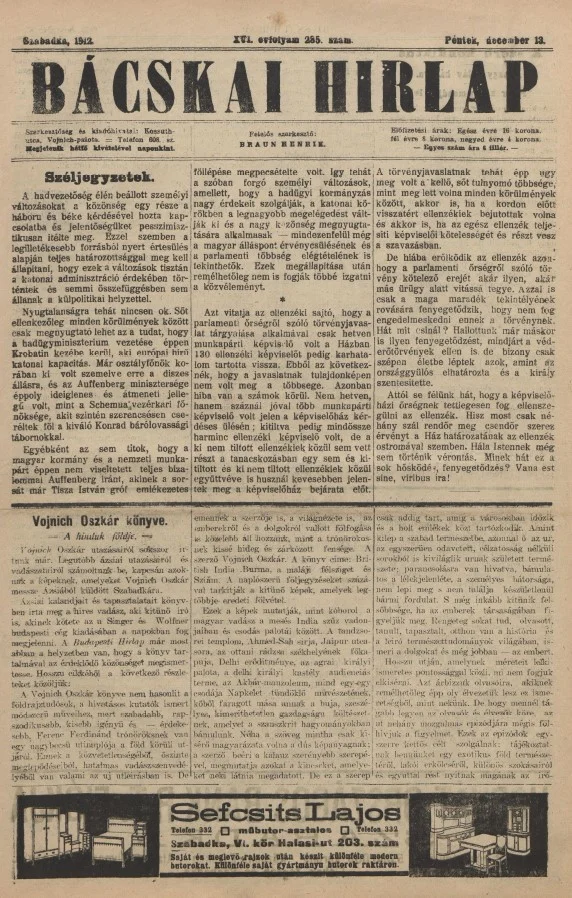 Bácskai Hirlap, 16. évf. 1912. december 13. 285. sz.