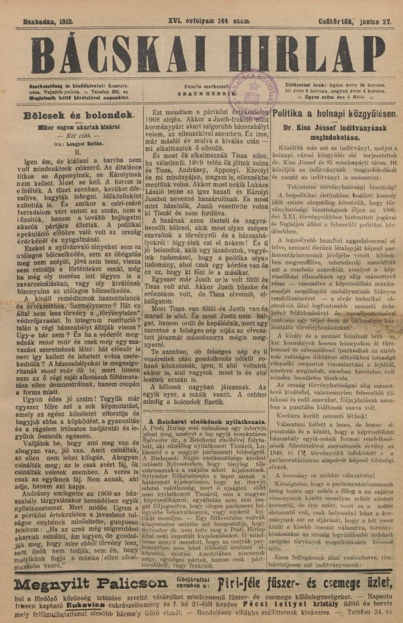 Bácskai Hirlap, 16. évf. 1912. június 27. 144. sz.