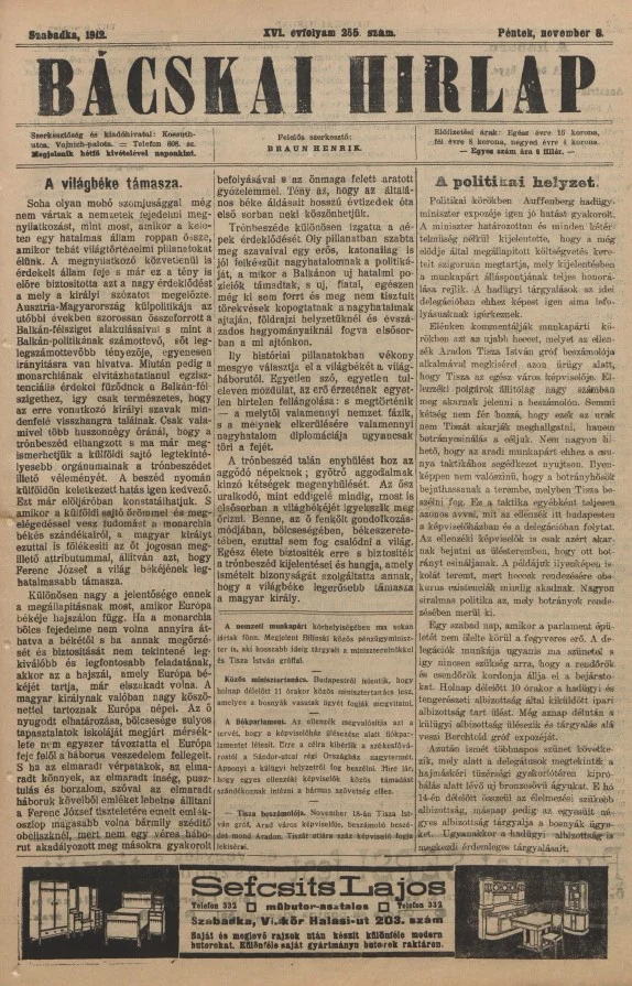 Bácskai Hirlap, 16. évf. 1912. november 8. 255. sz.