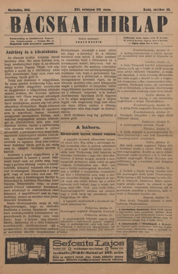 Bácskai Hirlap, 16. évf. 1912. október 22. 241. sz.