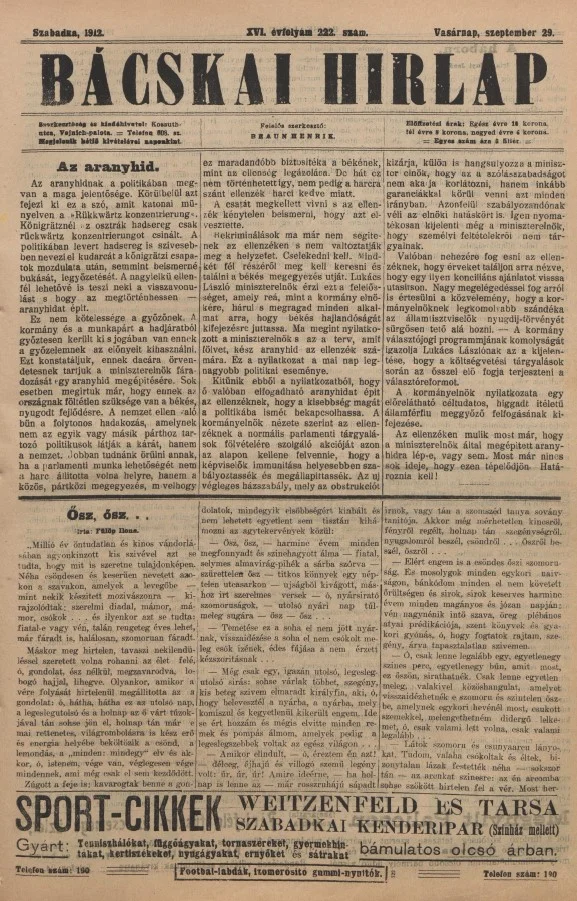 Bácskai Hirlap, 16. évf. 1912. szeptember 29. 222. sz.