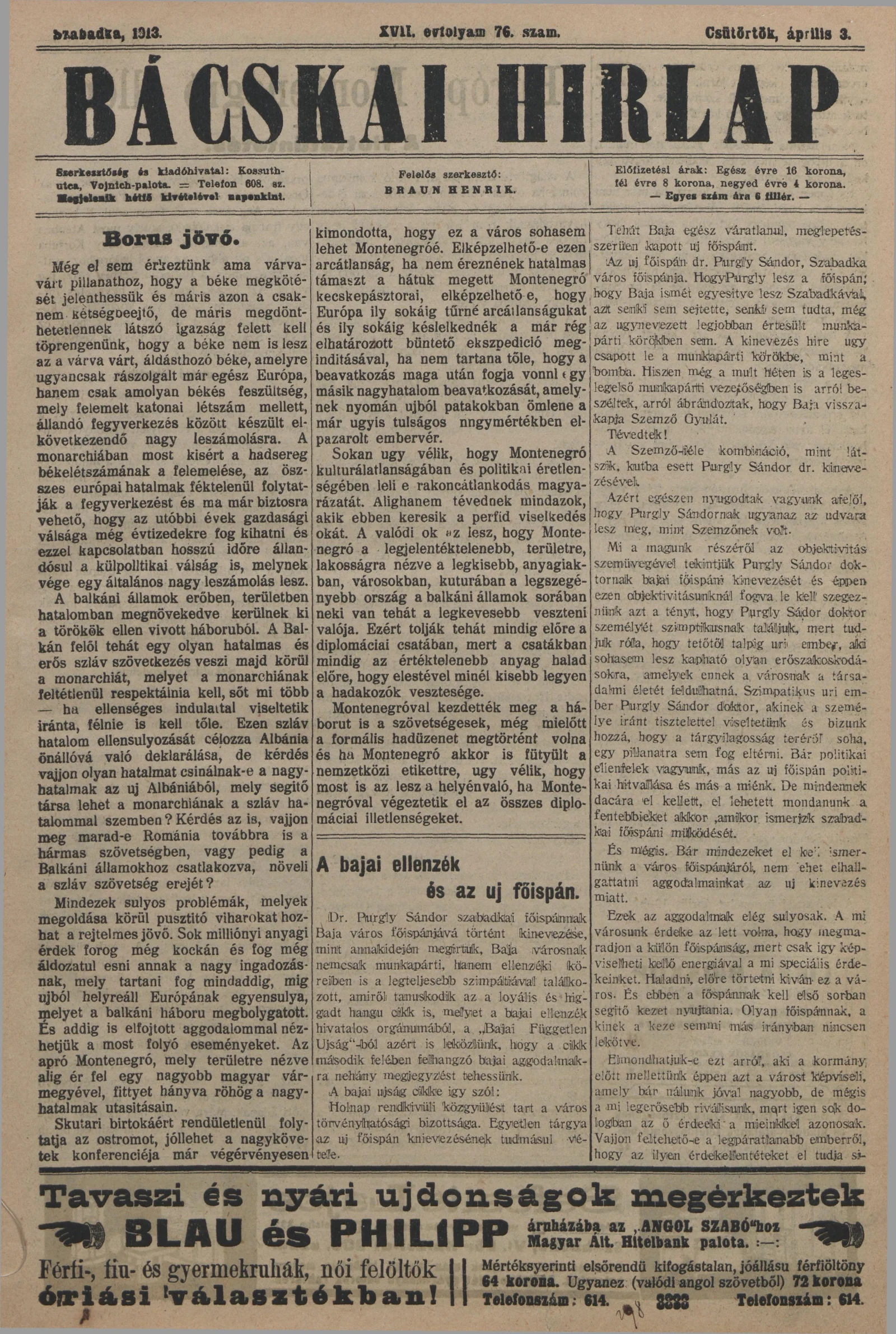 Bácskai Hirlap, 17. évf. 1913. április 3. 76. sz.