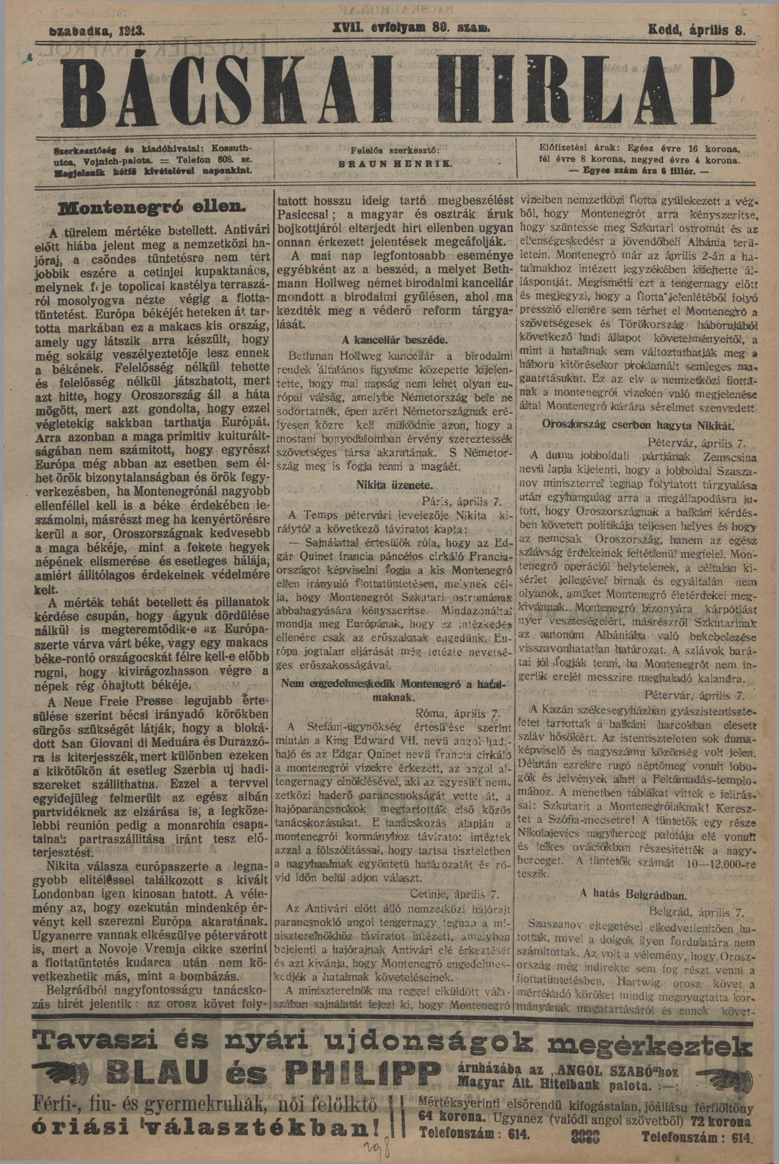 Bácskai Hirlap, 17. évf. 1913. április 8. 80. sz.