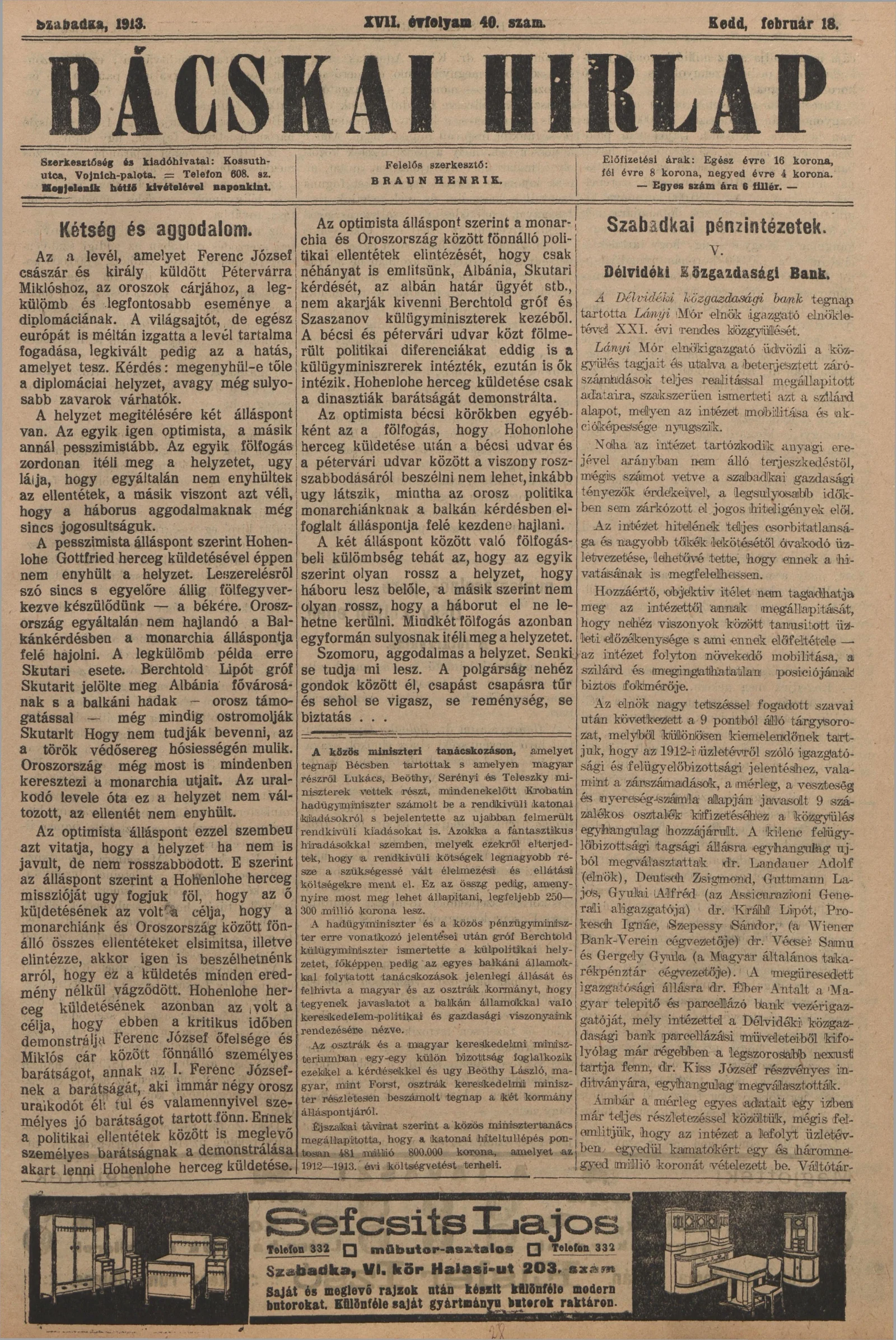 Bácskai Hirlap, 17. évf. 1913. február 18. 40. sz.