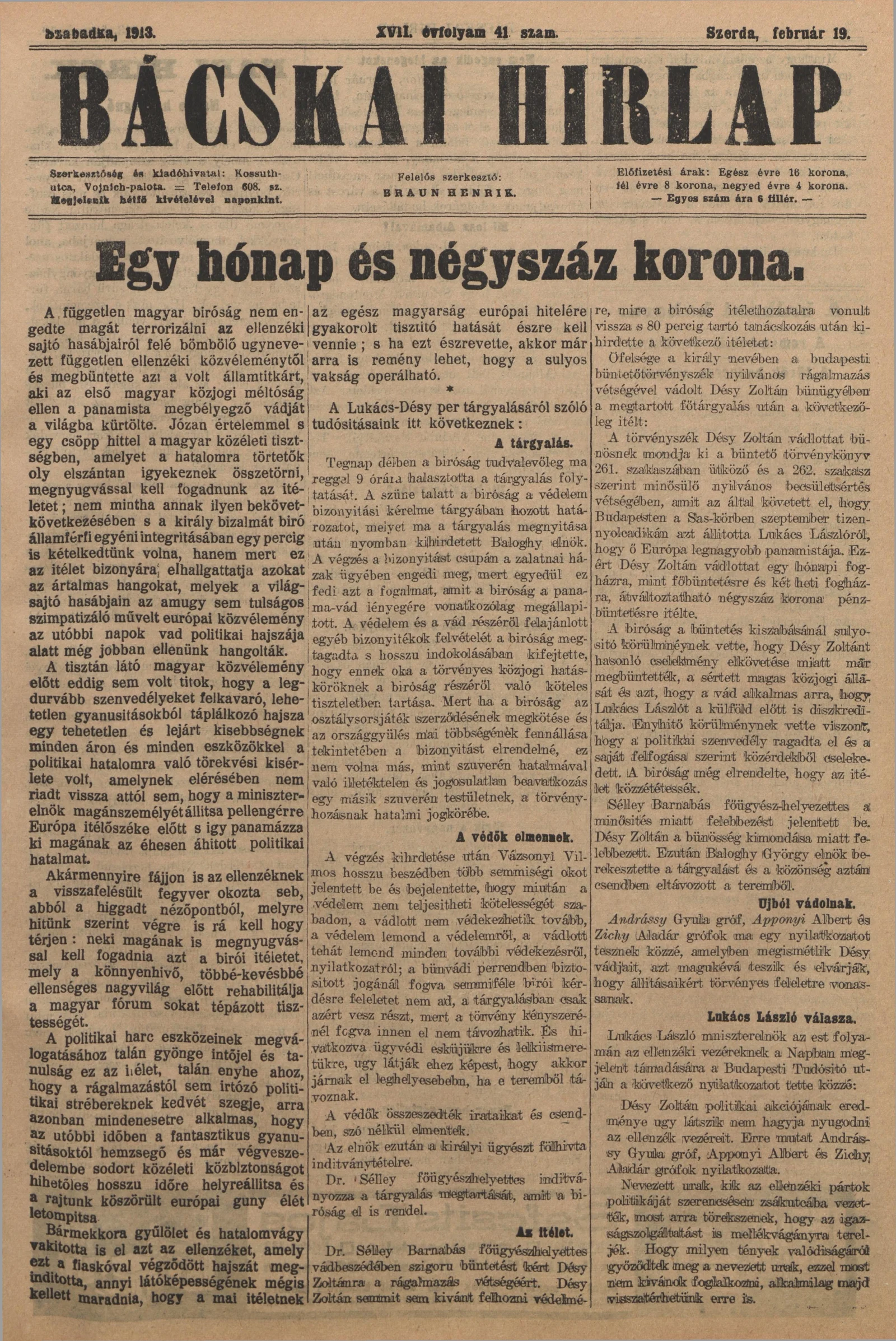 Bácskai Hirlap, 17. évf. 1913. február 19. 41. sz.