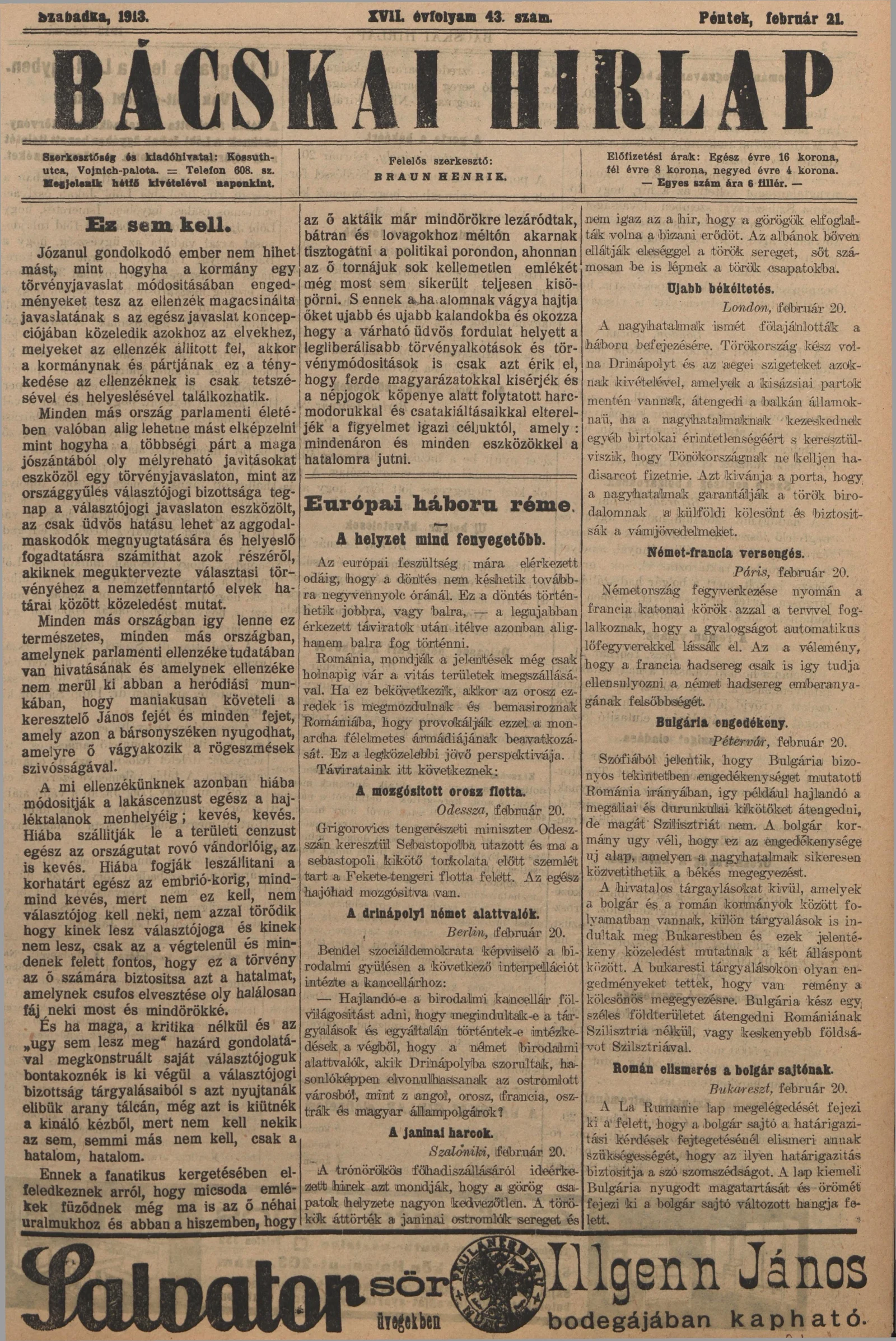 Bácskai Hirlap, 17. évf. 1913. február 21. 43. sz.