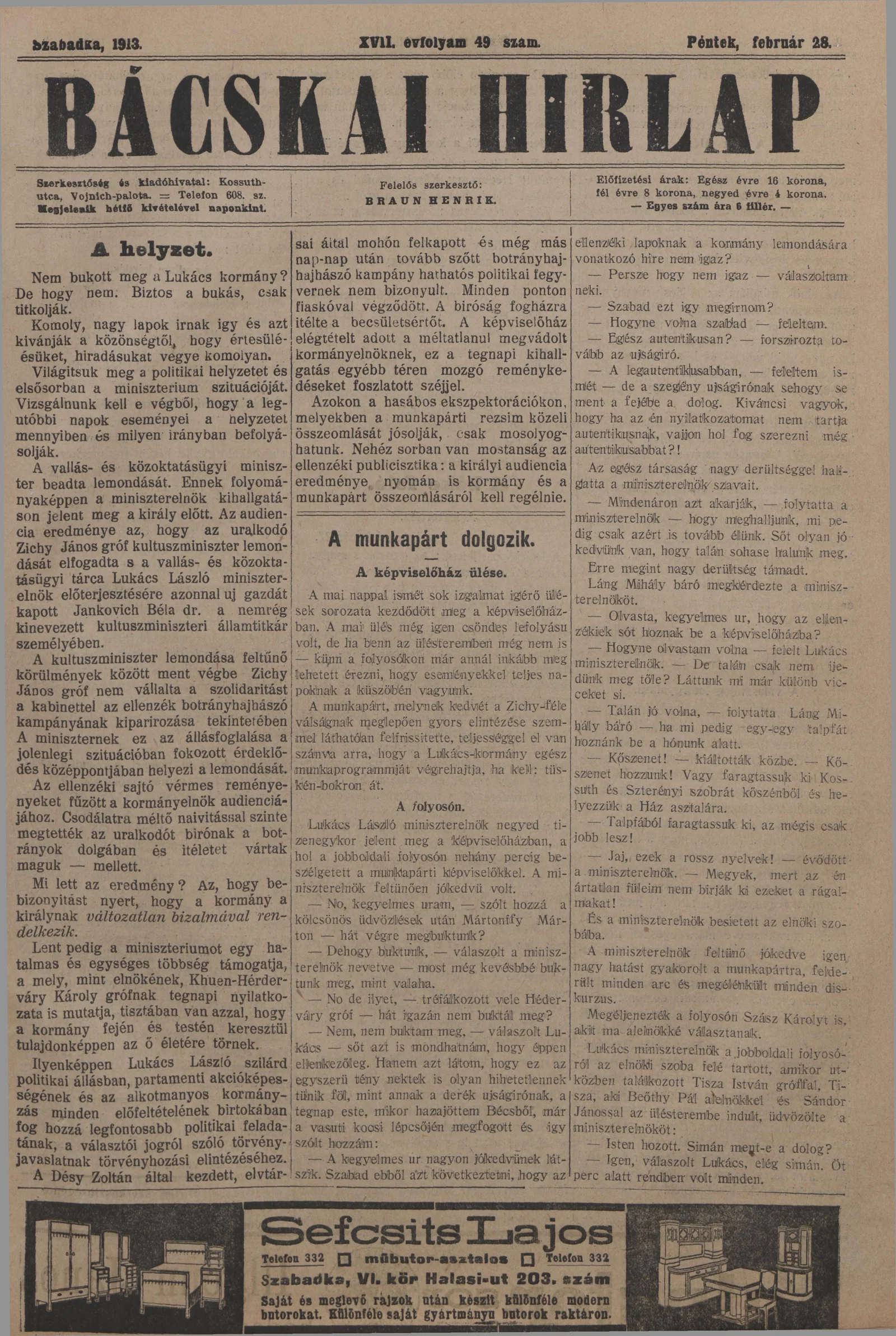 Bácskai Hirlap, 17. évf. 1913. február 28. 49. sz.
