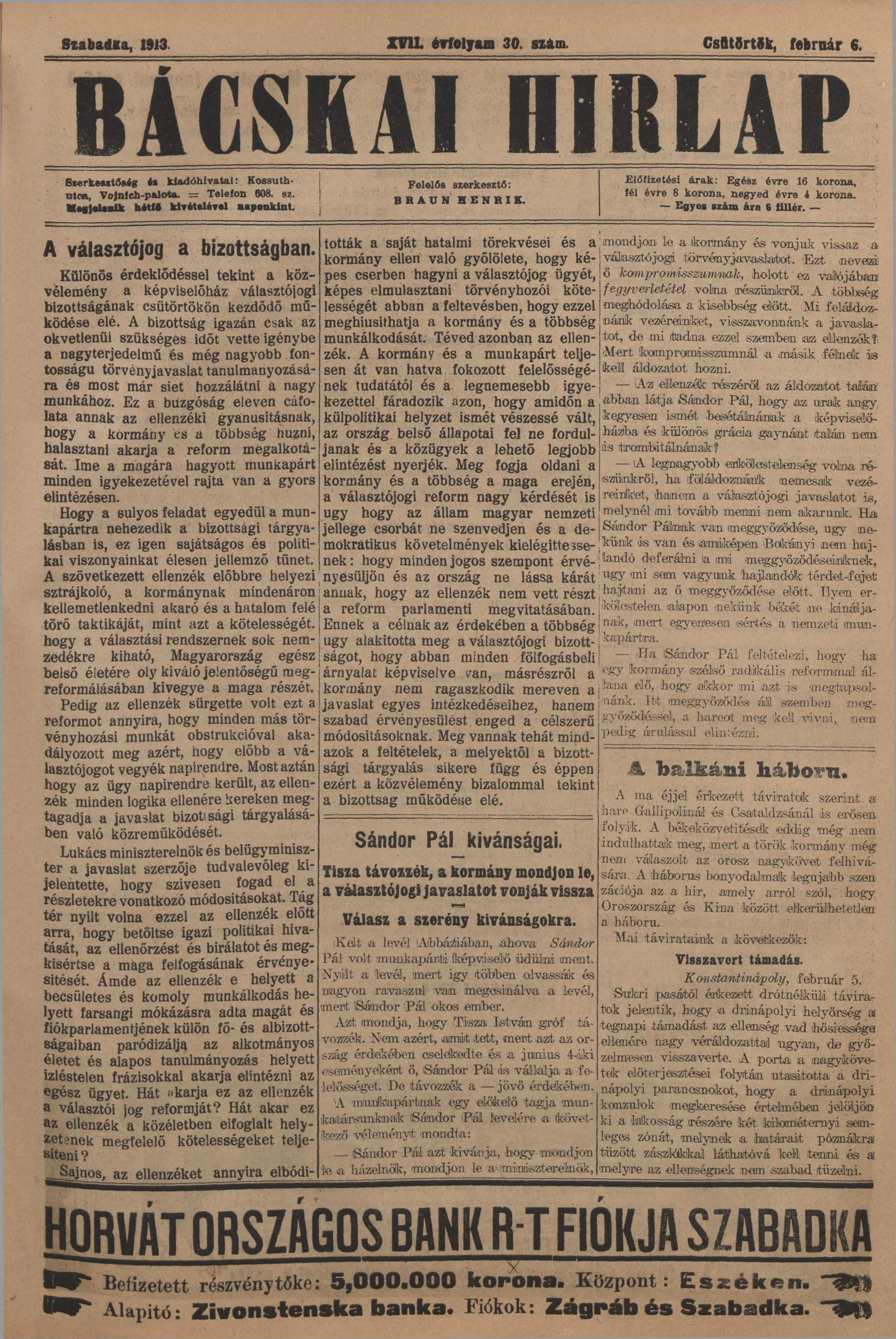 Bácskai Hirlap, 17. évf. 1913. február 6. 30. sz.