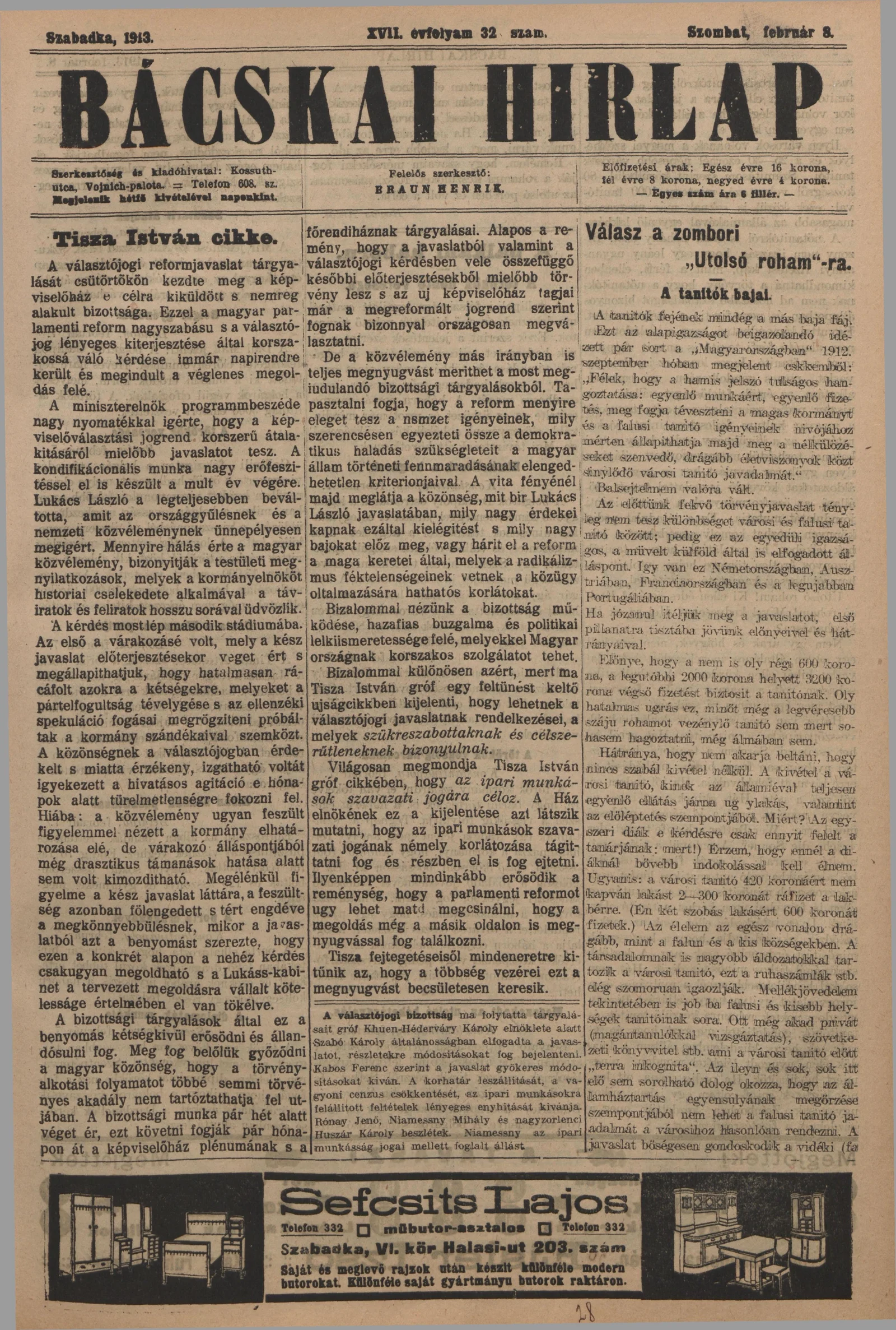 Bácskai Hirlap, 17. évf. 1913. február 8. 32. sz.